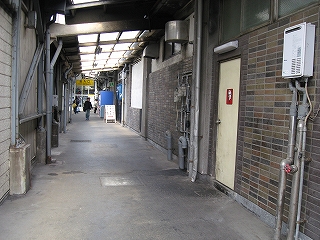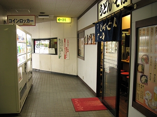 待合所を過ぎて奥の通路。外に出られるようだ。右手のうどん・そば屋は改札内外から利用できるようになっていた。