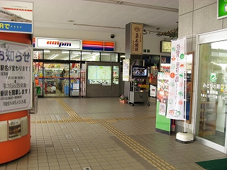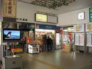 待合所への入口と売店のある駅舎内の風景。
