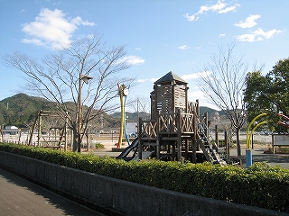 下りホーム背後にある公園の様子。木製の塔が置かれていておもしろそう。