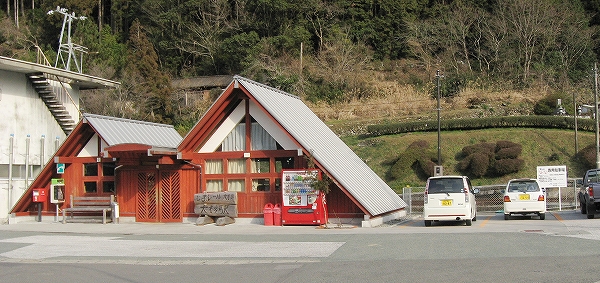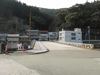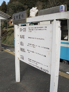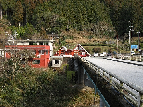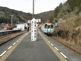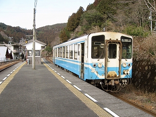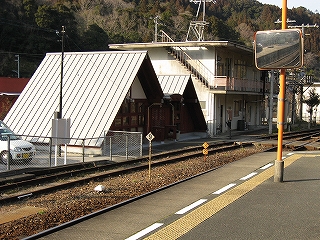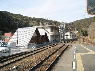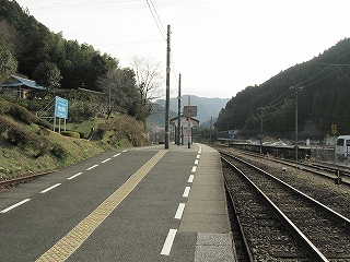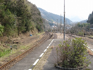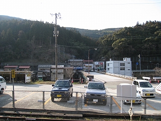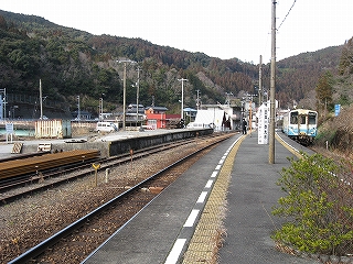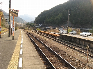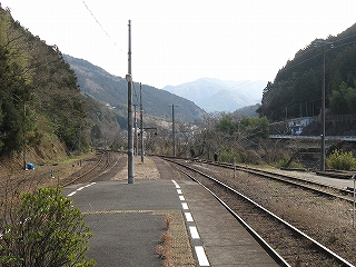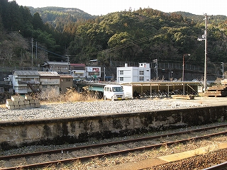 ホームから見える風景というのも特に何かあるわけでなく、相変わらずの渓谷地だった。しかし駅前は広くとってあり、対岸の国道の信号も見えて、町らしい感じがあり、独りで納得した。ただ、この手狭なところにあって旧貨物ホームや積み出しの敷地があり、規模がなかったわけではないようだ。構内踏切に近づいたとき、駅舎の横にある傷んだ建物が乗務員関係の建物だともわかった。なんだ、立派な駅だ。しかし今はどんな風に使われているのだろう。とくにここ始発の列車もない。