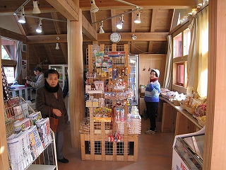 さて駅舎に入ろうと扉の前に立つと引き戸が抽象的な杉の模様になっていて、やっぱり地名の形象を込めるんだと、期待が薄れた。だが中に入ると、狭いものの、杉の香りが漂い、光が差し込み、とにかく新しくてきれいで、ちょっと感嘆の声が漏れた。いい杉をたくさん使った贅沢な駅舎で、ひとまず来訪者をこの杉自慢で溺れさせるつもりのようだ。狭いのは通路になってるからで、片方ずつにお店そして待合室とある。でもこの通路がもっとも明るく、木の美しさがもっともよくわかった。少し後になって気づいたが、通路に面して、ささやかな出札口もあった。すべてを備えてしまった駅かのように一瞬思えた。