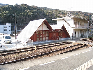 駅前は駅のためだけに架橋してあり、さすが大杉駅と思うことにした。そして駅舎を見る。珍しいのは、朱色だということだった。そして山の斜面に「大杉」と描いた植栽が駅舎の横に来るようにしてあり、かなり凝りようだ。町いちばんの駅には、これぐらいは、といわれているようだった。三角を二つ置いた建物にしたのは夫婦杉を模したといい、デザインの方法としては二見浦駅を思い起こす案外障りのないものとなっていた。とまレール大杉、の字は、これもまた少しがくがくしてある。そういう名前をここにつけたようだった。