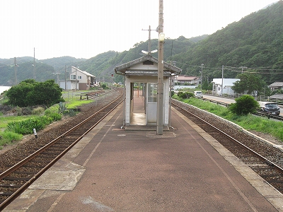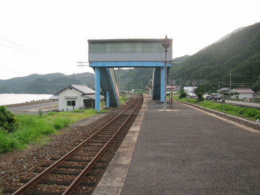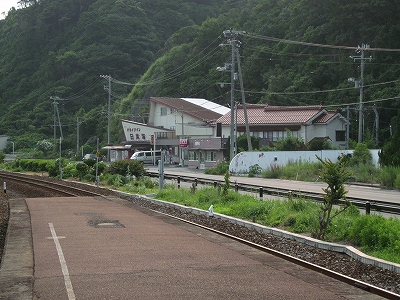 朝を急ぐドライバーに心の中で会釈しながらホームを歩く。離れて日本海ドライブインなるものがあった。実はここは前後に長々と無人地帯を抱える中で、わずかに拓けた特異な土地なんだ。地形図から察するに、かつては山仕事がメインだったようだ。