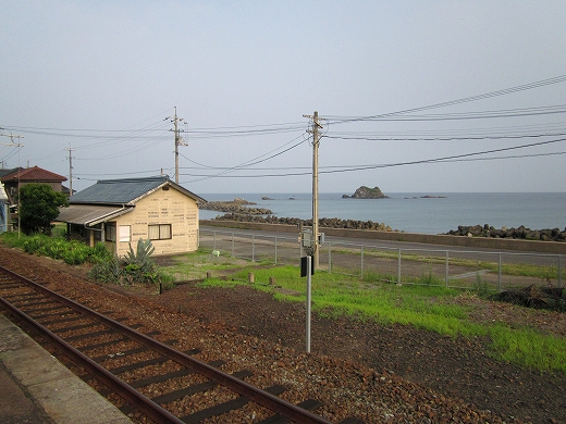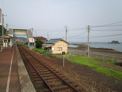 ホームに降り立つと片側は元気よく車走、もう片方は朝の青空が朝日のバーナーに熱せられるいっぽう、愈々海は蒼然と深まる、そんな様相で、何か鉄のにおいが混じったような潮の匂いが縹渺としていた。