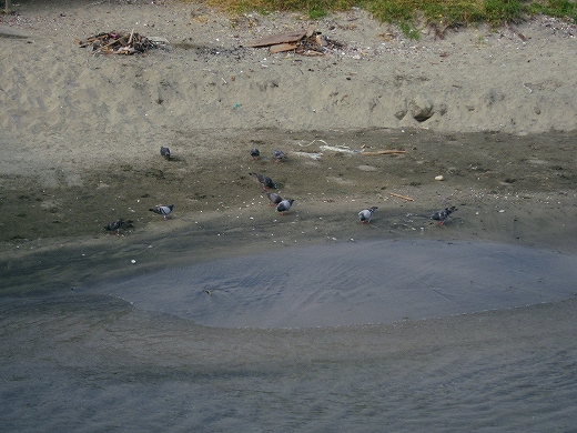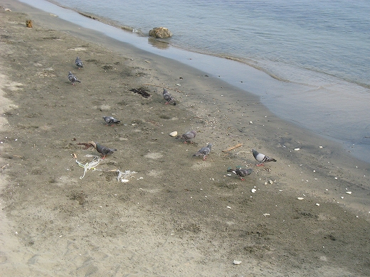 黒い浜ではドバトがいっぱい散らばり、赤い朝日の中、朝食を摂っていて、ひどい生臭さが立ち昇っていた。