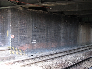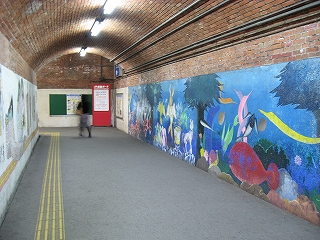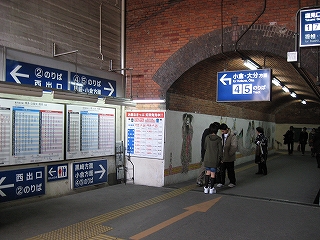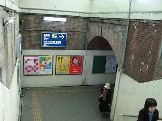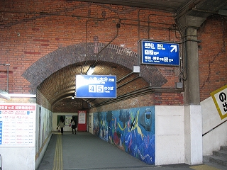 まだ通路が続いているな、と、店の脇を覗くと、暗い中にレンガ積みのポータルがどん、と現れて「これがうわさのレンガ積みか」。なんかレンガ横丁みたいである。けれど重厚美というより、腰回りは白く塗って壁画を書いてみたり、新手の案内板を乱発したりで、今に合うように最大限活用しているといった趣となっていた。それはなにか逞しい無意識の美でもある。街がまだ真価を知らない、というような…。けれどそれは違い、利用者があまりに多い都市駅となってしまったため、そんなこといってられなかったというのが真相のようだった。