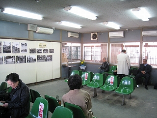 待合室内の様子。汽車時代の折尾駅の風景写真が飾られている。