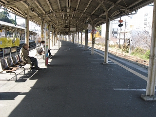 2つの乗り場はカーブし、日当たりが良かった。あんな日陰の建物の駅で、利用する人はいるのだろうかと思ったが、こうして中に入ると、日射しの中、人がしゃがんだり立ったりして、列車を待っているのだった。しかし案の定、黒崎・小倉のりばには誰もいない。その方面に行くなら、本式の駅舎の方が本数が多いのだ。もっぱら筑豊から来た人の降車ホームなのかもしれない。