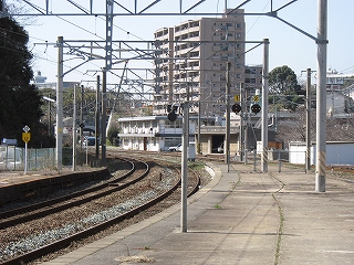 踏切前。直進が6番のりば、黒崎・小倉方面。