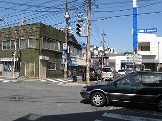 折尾駅入口の交差点の海側。交通量は多い。そしてあたりはぜんたいに未整備でいびつな感じ。