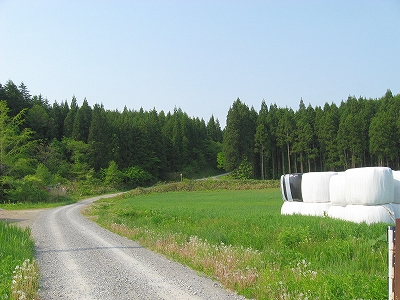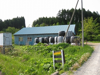 積まれた秣ロール見える赤い小屋 鉄道の音でなく小鳥の声