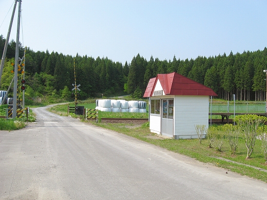 神社道路踏切と名付けられている。黒い物体は牧草をビニールでロールしたもの。