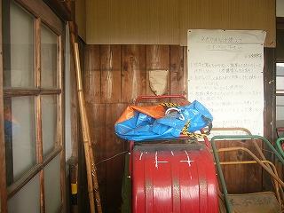 物置を見るとあからさまに木造なのがわかった。除雪機が置いてあり、武生管理駅長の手書きマジックによる「これだけは必ず読んで必ず守ってください」の注意書きがある。「帽子で耳をふさがない、視界をさまたげるものは使用しない。(保護帽子の完全着用)」など。
