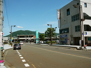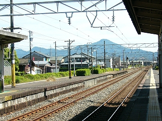 少し離れて見ると、奥の橋立山と駅舎が一緒に見えた。駅にまっすぐやってくるこの道をいつも走っている人は、この山のことを忘れないだろう。その風景は少し今庄が迫ってきているように思わせた。