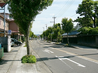 福井方に伸びる道。1.5車線の道に街路樹、融雪装置。歩いてみたくなる。