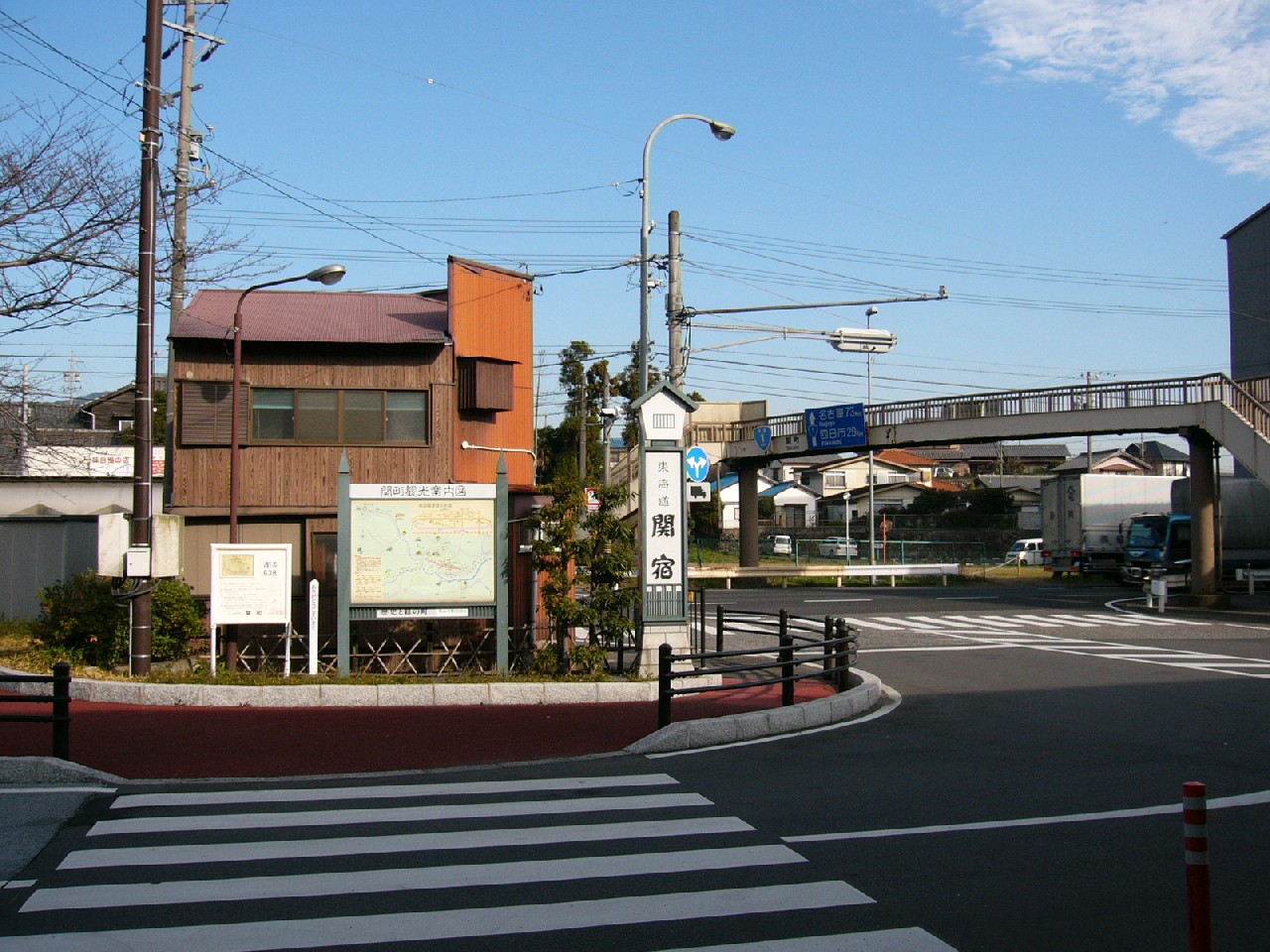駅を出ると、やや広いアスファルトの敷地を挟んだ向こうに、 国道1号線が横切っていて、とても賑やかな雰囲気だった。 国道を向こうに渡るための歩道橋の欄干に取り付けられた 青い看板には名古屋、四日市までの距離が書かれていて、 その横には国道1号のおむすびまであり、 国道1号という大動脈を途中からちらっと覗いた感じがした。 ちなみに、青い看板には名古屋73km,四日市29kmという距離表示だった。 関西本線の営業キロではここ関駅から名古屋まで65.6km,四日市までは28.4kmとなっている。 駅から出た左手奥にはできたばかりの大きなロータリー式の駐車場が設けられ、 そのさらに奥には垣根を挟んで道の駅が造られてあった。