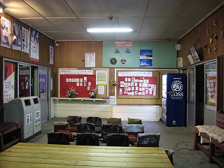 皆の列のしんがりに付いてさっと駅舎の中に入ったとたん、わあっと見回して、それはそれはもうたいそう歓んだ。とにかく温かげな雰囲気、そして広く、頑丈な据え付け長椅子が申し分なくぐるりと廻され、珍しいことにそこらへんの森から切りだしたのか、大きな天然のテーブルが置いてある。食事ができるじゃないか。壁には鹿部の人たちの作品がいっぱい飾られ、自動販売機まで置いてあった。「もうこれは言うことない。感謝せねば。いやいや、昨日の桂岡駅が異常だっんだよ。あれはひどかった。でも今晩はほんとに助かった。やっぱり北海道まで来てよかったよ。」