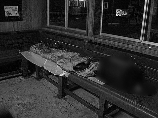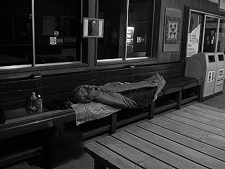 もう後は早く就寝するだけだ。シートを敷いてシュラフをスタフバッグから引きずり出し、調える。扉は締め切らずできるだけ自然な感じで半閉じにした。そこでまできてふと、寝場所の上にたった一枚だけ気持ち悪い絵が飾ってあるのに気が付いた。その絵の人物は赤と黒の布団のようなものをかぶり、安らかに眠っている。自分の死を暗示している気がしてきた。ならば寝位置を変えればいいのだが、寝位置はどこでもよいというわけではなく、隅のうちでも最も落ち着く方、外から目立たぬ方を取るので、譲れない。絵をひっくり返そうかと思った。しかし仮初めでも勝手にするのは悪い。シュラフに入ってからもちょくちょく見上げたが、気に掛けないことに決めた。今日も寒いが、室内は昨日の駅より明らかに造りがよく温かいのでほとんど服を脱ぎ、寝袋に入る。肌に触れる心地よい清涼感のあるシュラフの裏地。「しかし室内に販売機があると無人の喫茶店のようだ。なんたる贅沢。しかも電灯が消えてもたぶん販売機の明かりは消えないからぐあいもいい。」。しかし、その機体、冷却音がかなりやかましい。グォォと鳴りっぱなしだ。おかげで冷却がはじまったり、終えたりする繰り返しを延々と聞かされる羽目になる。