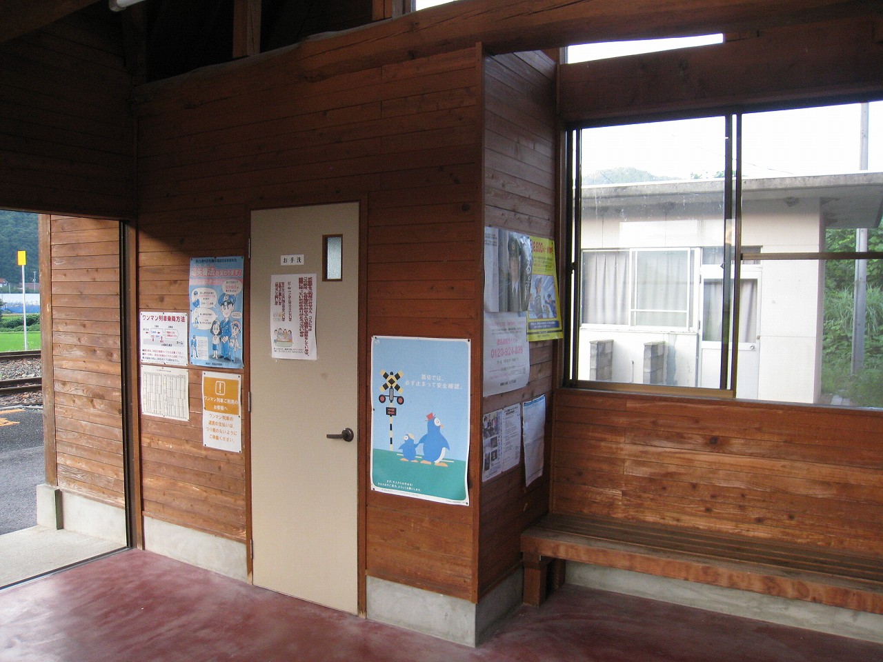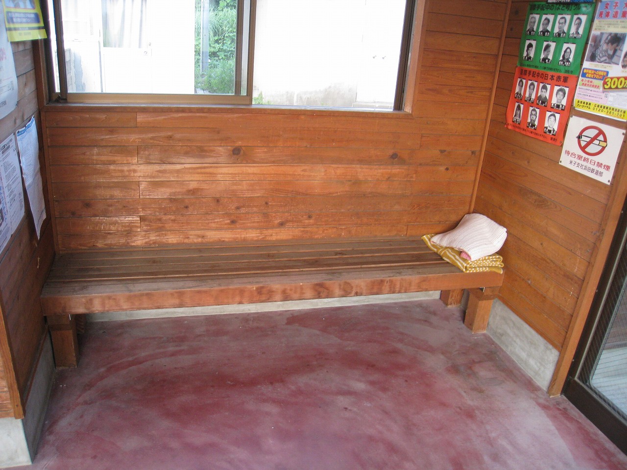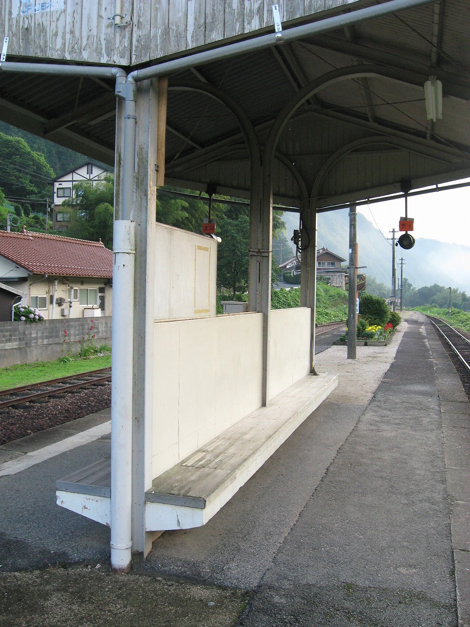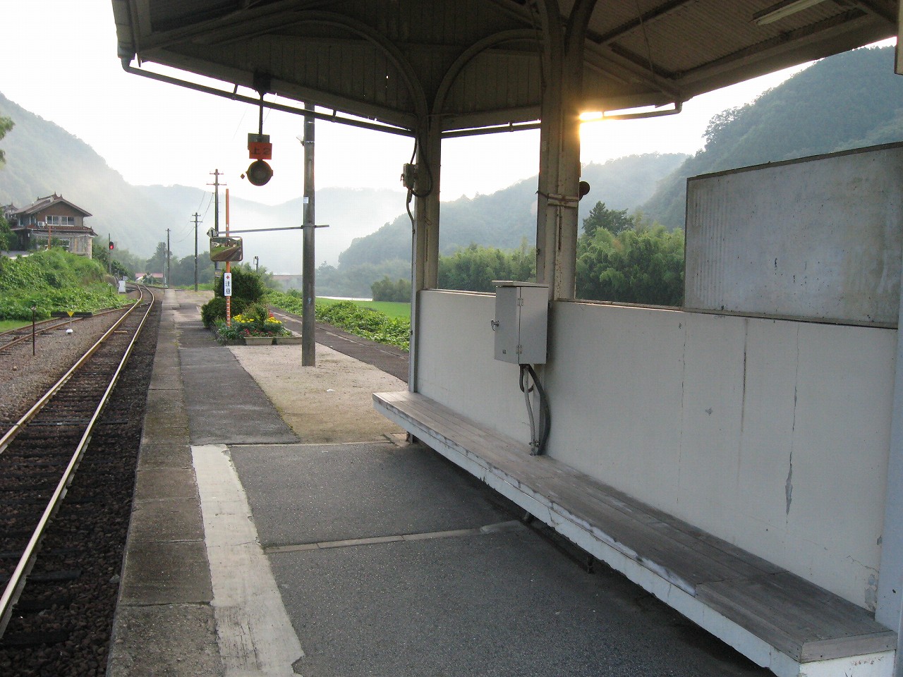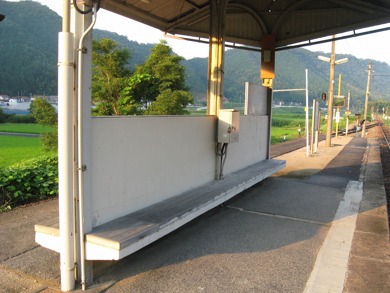 田舎の駅によくある屋根と椅子のセット。郷愁を誘います。