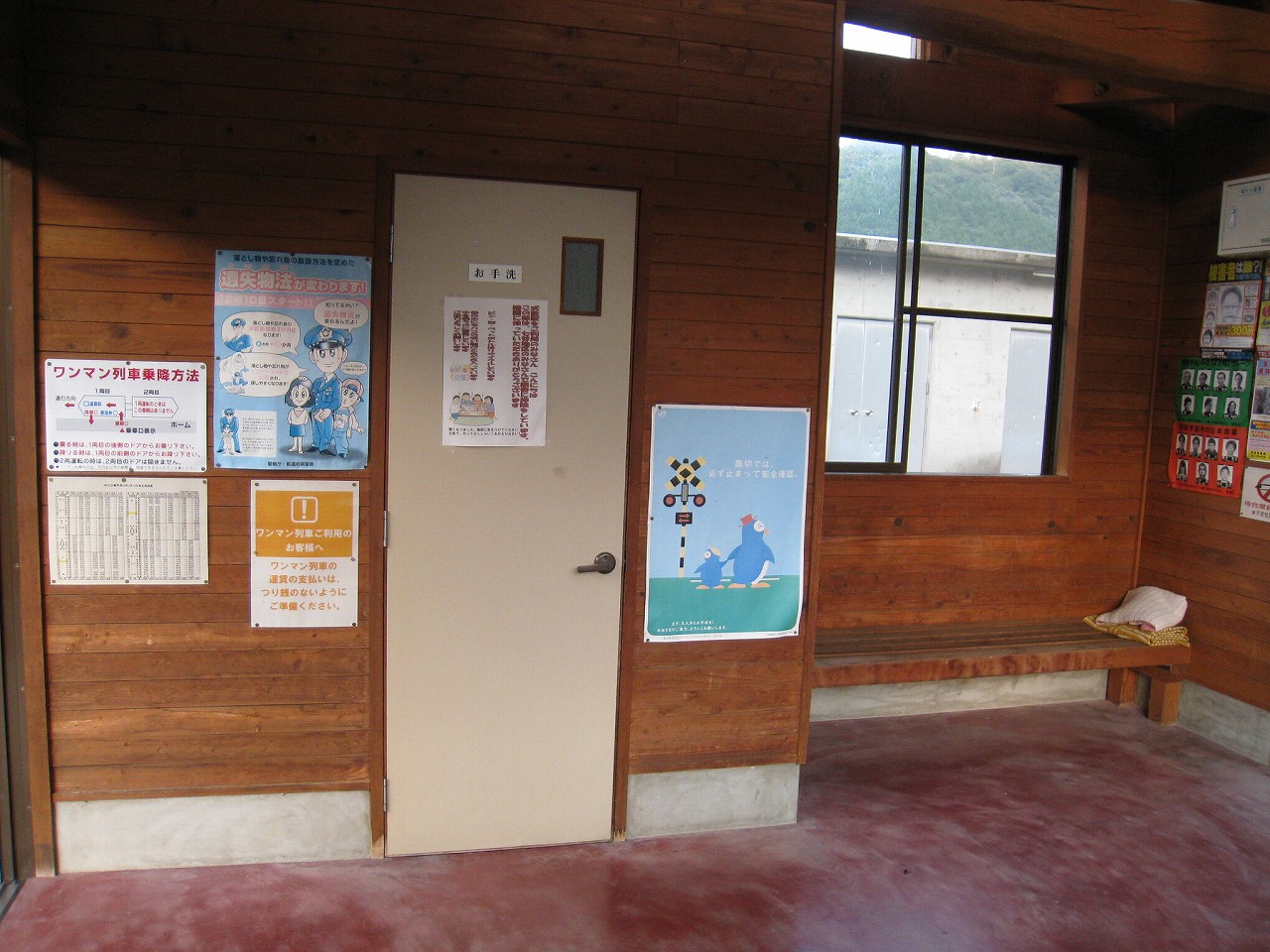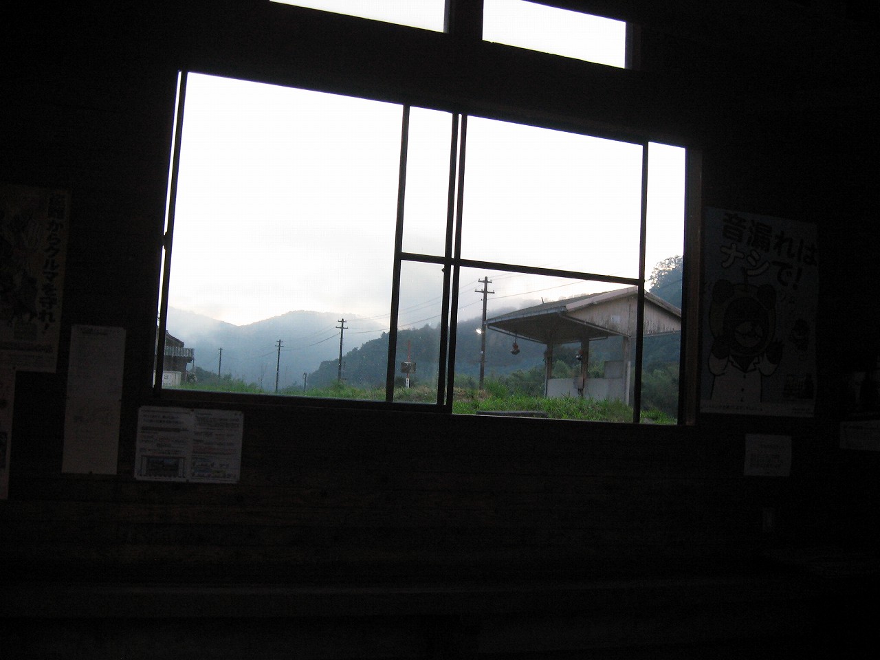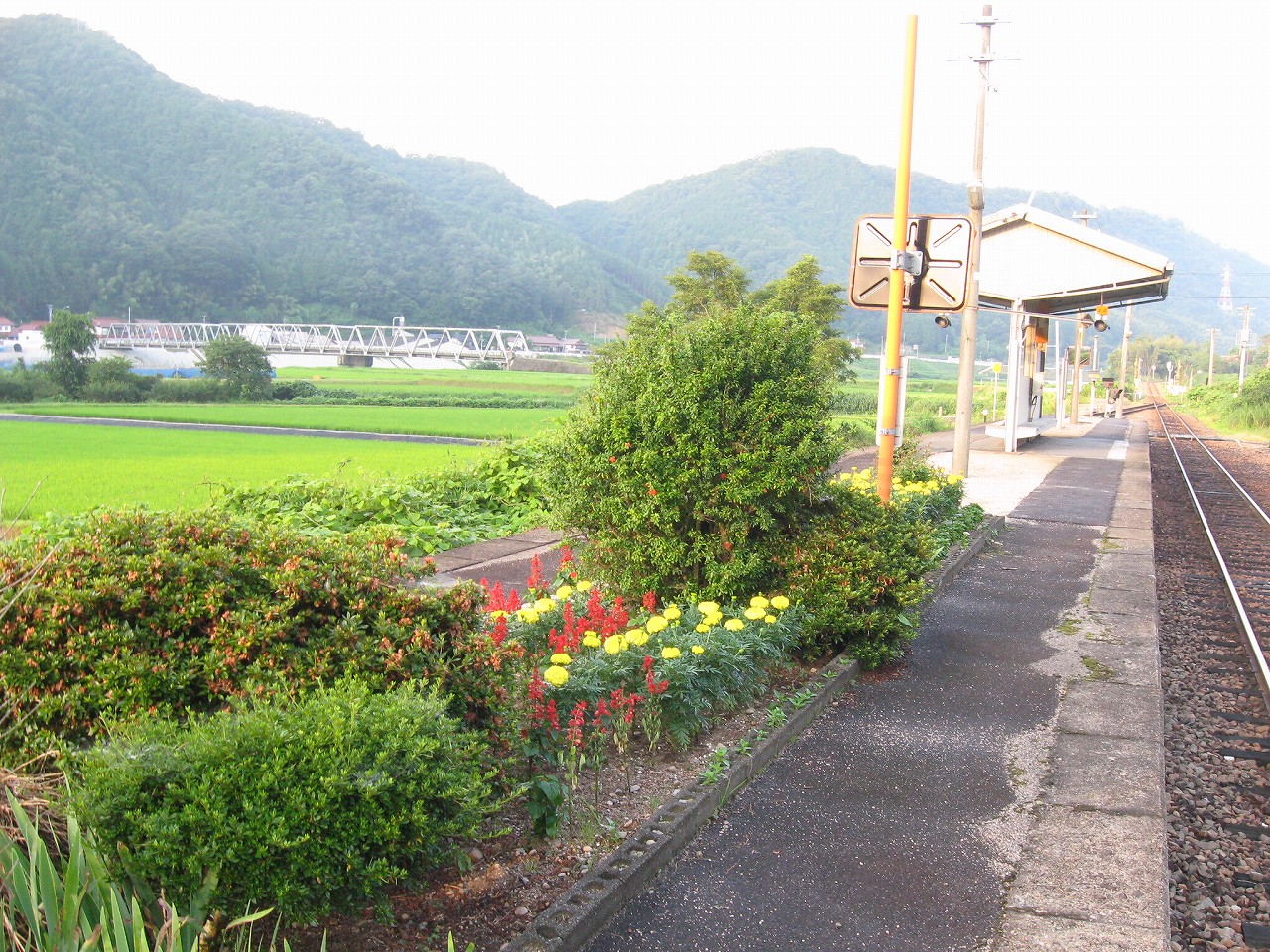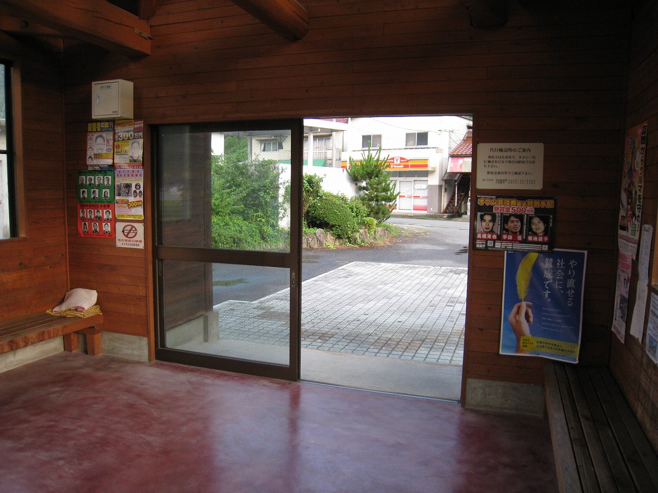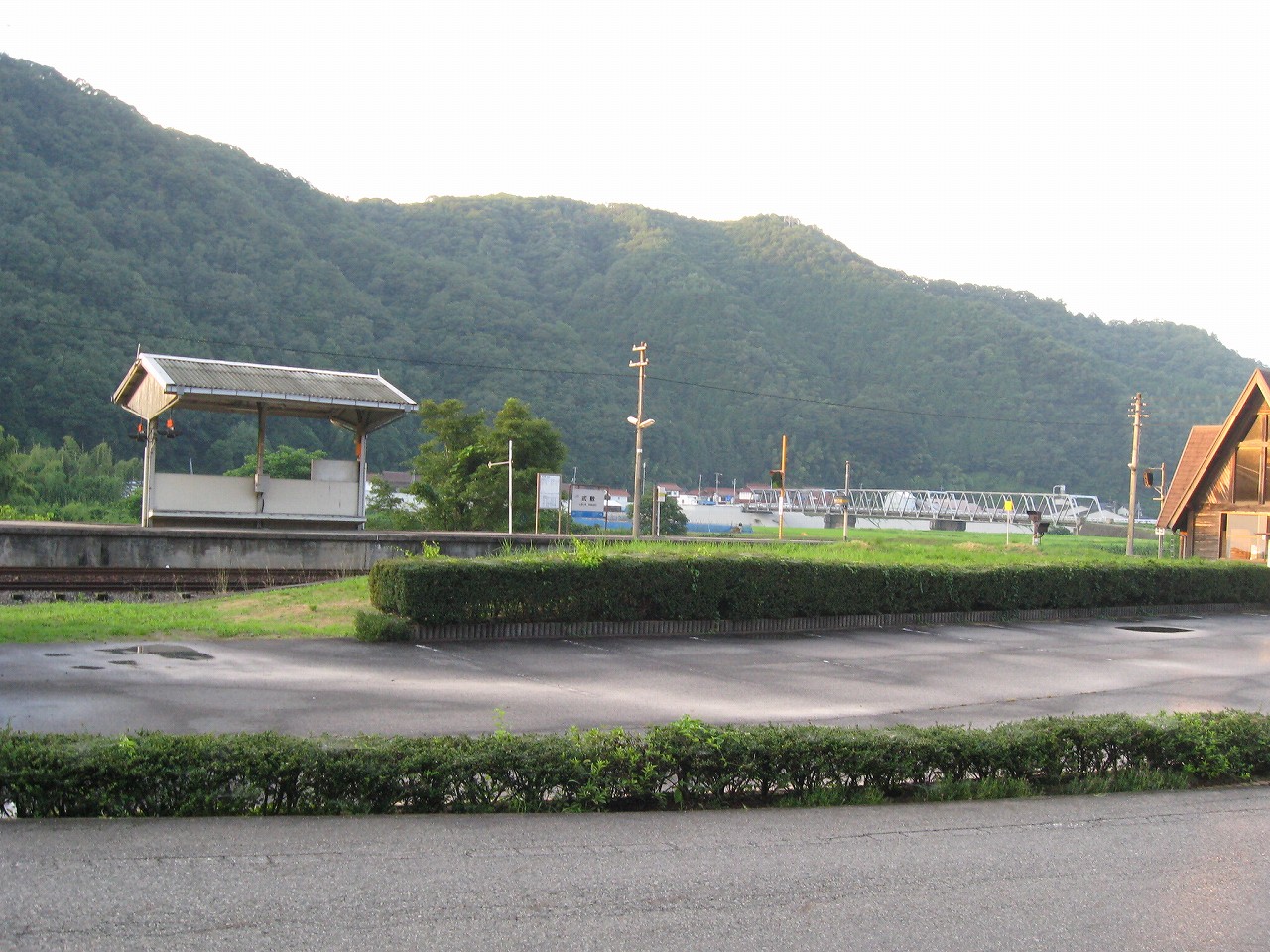 田舎の駅によくある屋根と椅子のセット。郷愁を誘います。