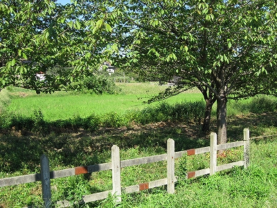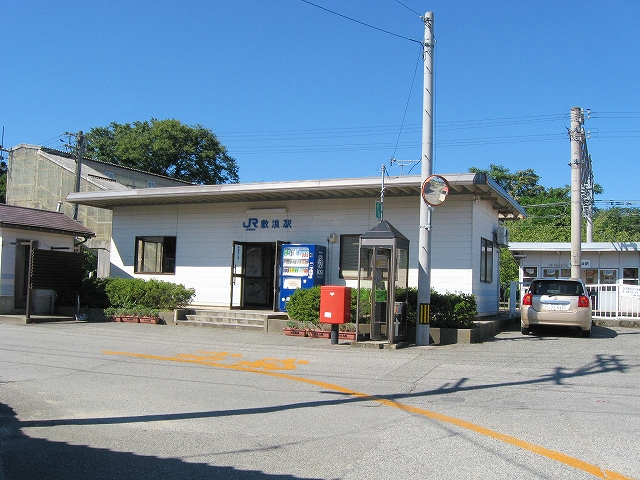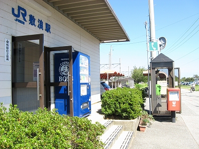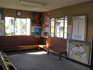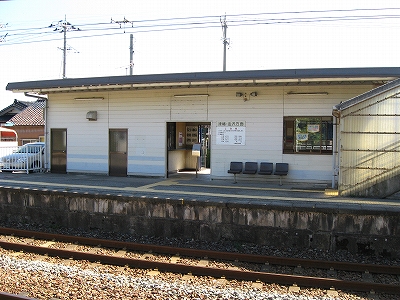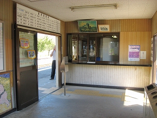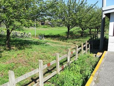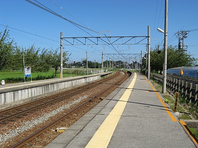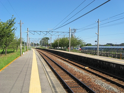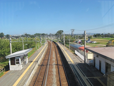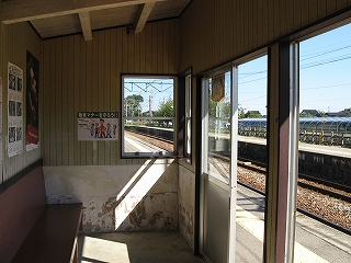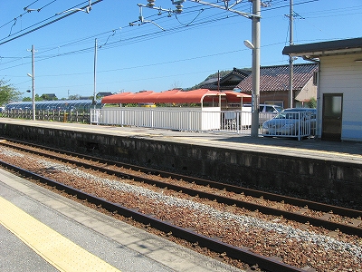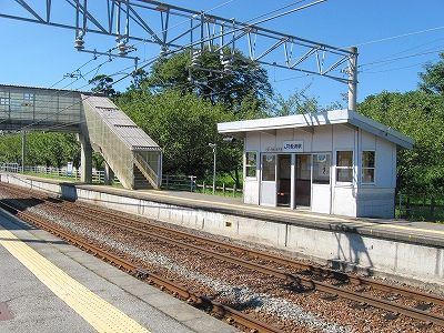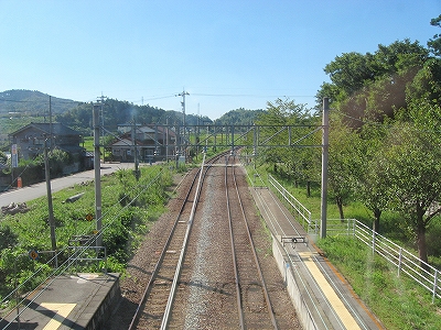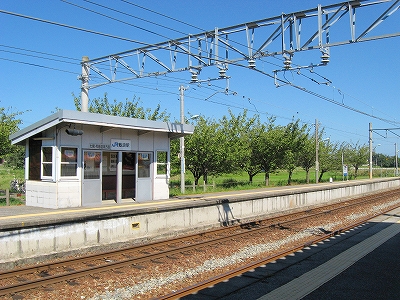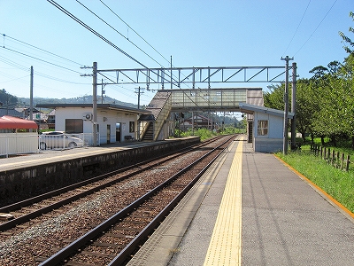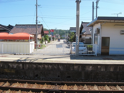 列車が出ると、落葉高木や果樹や、草原 (くさはら) の緑が美しく、いい木陰もできていて、雲ひとつ浮かばない苦しいほどの盛夏の天気なのに、風が心地よく、死んだようだった目がしだいに見開かされた。駅構内は単純で、ホーム2つに、小さな四角い駅舎があるだけだったが、ここがこの日降りた中ではもっとも、印象に残る駅だった。丘が近く陰やうっとうしさが友となりそうな小駅であるものの、七尾線の中でも、明るい駅に入りそうだ。