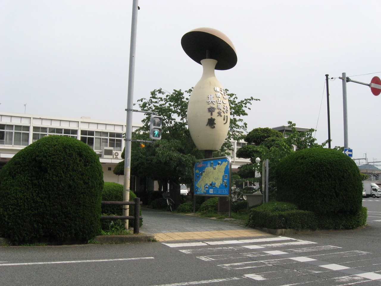 新幹線駅舎側にも種田山頭火像があったが、ここにはとっくりと旅の笠を組み合わせたモニュメントがあった。なんだか松茸のように見えるけど、酒と旅を愛した山頭火を表しているというわけだ。其中庵といういおりがこの近くにあり、彼はそこでゆっくりと暮らしたそうだ。