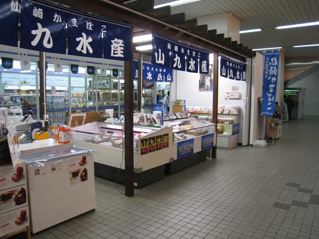 控えめなオフホワイトのタイルの駅舎内を歩きながら、80年代を思い出しつつお土産屋を覗いた。仙崎蒲鉾など、加工品が多い。長門や下関ももう手元にある感じだ。