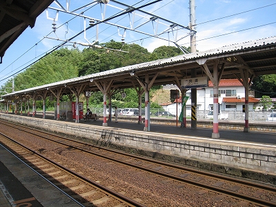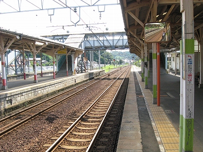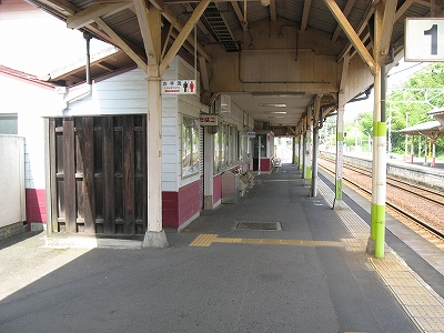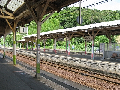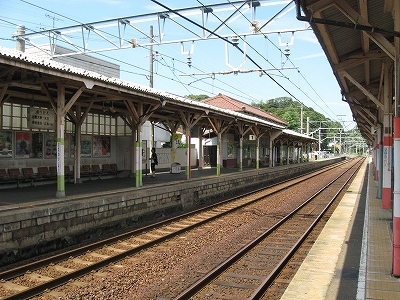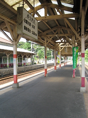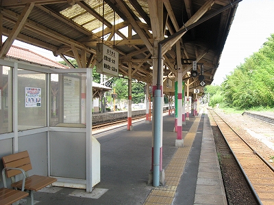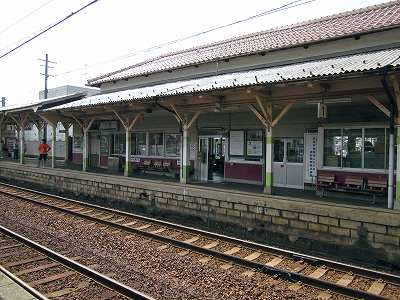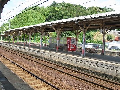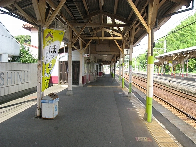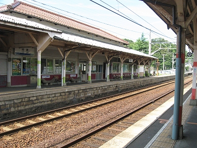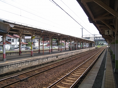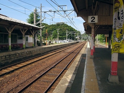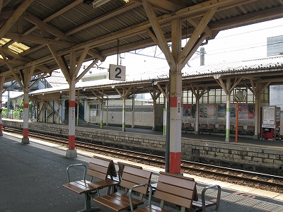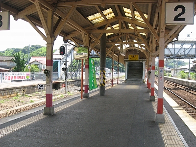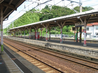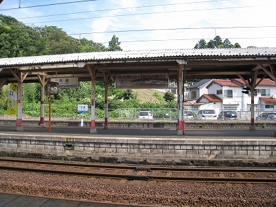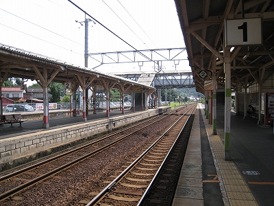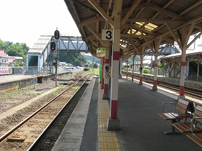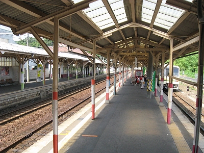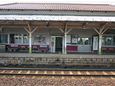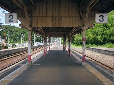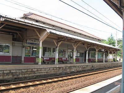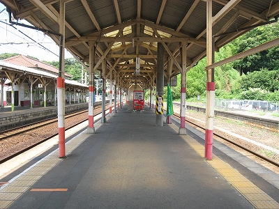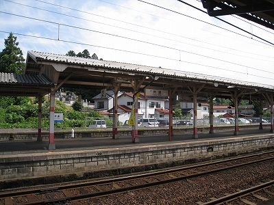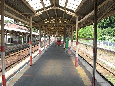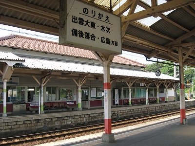 山型の上屋の向うには森の緑が見えて、反対の駅舎は赤い石州瓦だった。