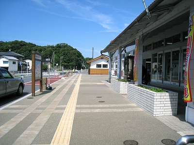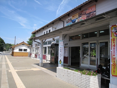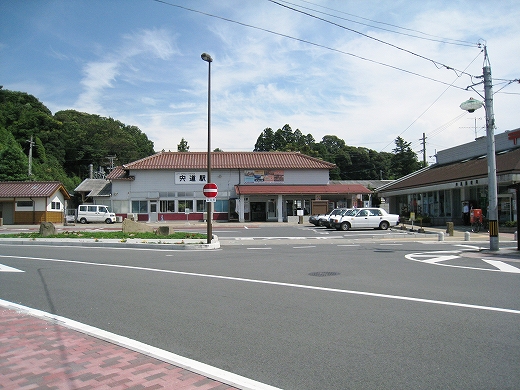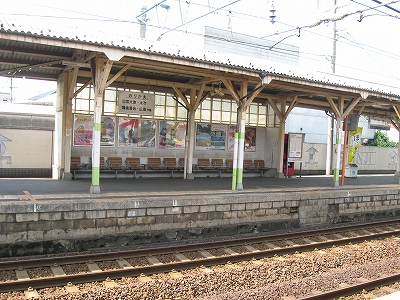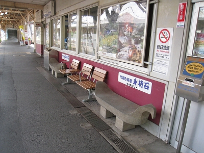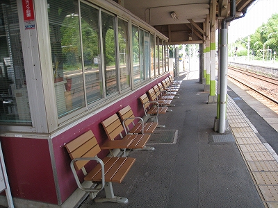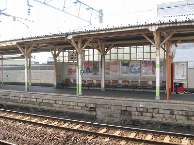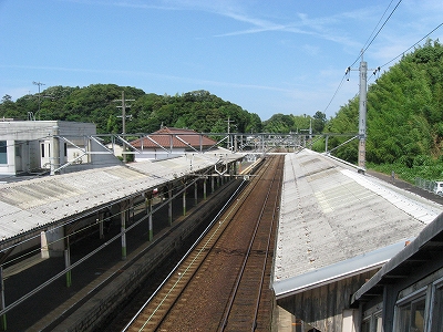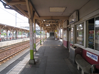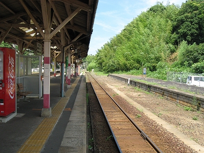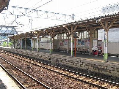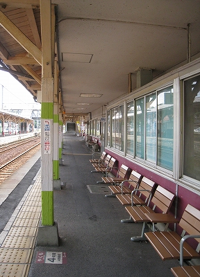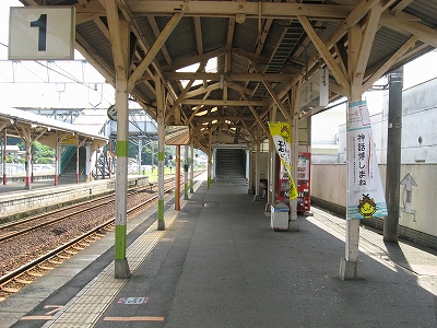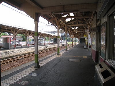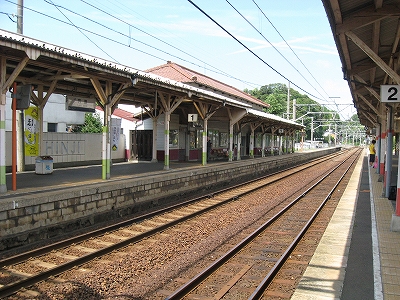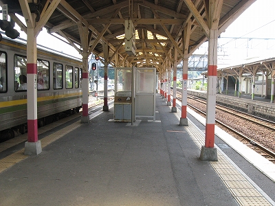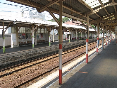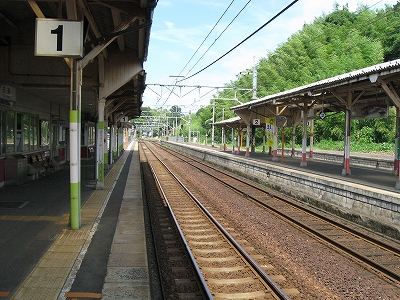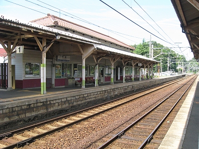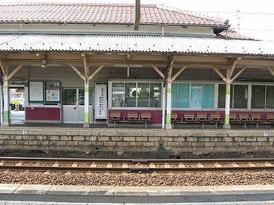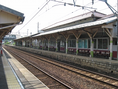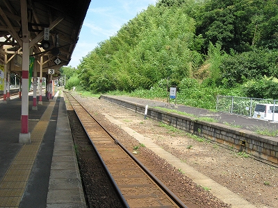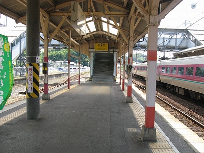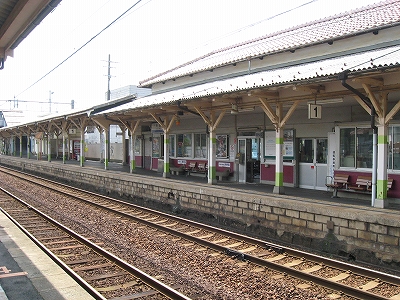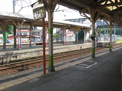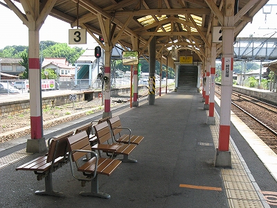 山型の上屋の向うには森の緑が見えて、反対の駅舎は赤い石州瓦だった。