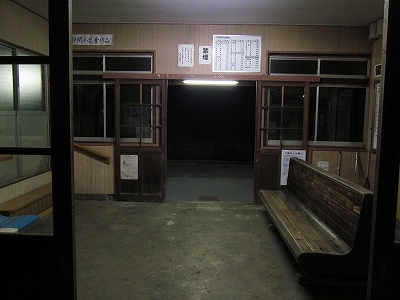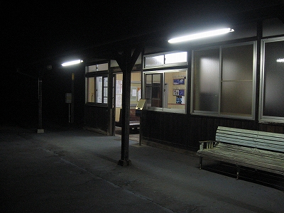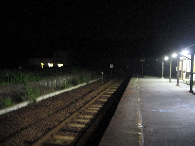 気動車がドクドク夜気の露払い、たいへん賑やかな十数秒だ。やがて列車が浜田への闇と吸い込まれると、ホームは夏だというのに肌寒く、夥しいカエルの声が夜の空間を震わせている。そして眼前には、夜気をいっぱいに吸い込んだ板壁の駅舎が、ぽっかりと明るく口を開けて佇んでいる。
