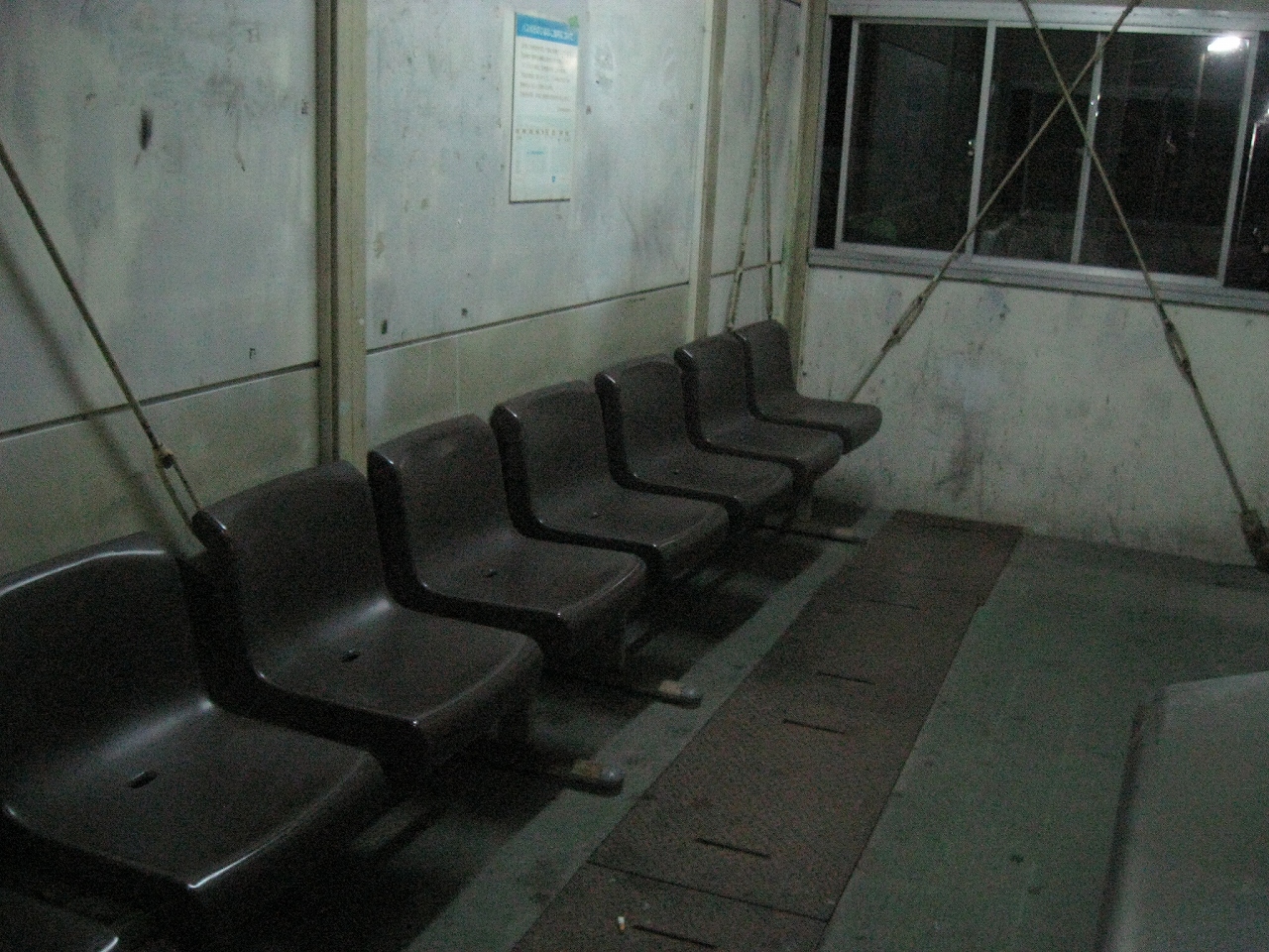 駅舎は今にも崩れそうな木造舎で潮風が吹き込み放題だ。ぼんやりとともる明かりのもと、コゲ茶の樹脂製の連続個掛け椅子をみとめる。たぶんここで寝ることになるだろう。が、しかし、まさかこの決定がこの後とんでもないことにつながるとは思いにもよらず…