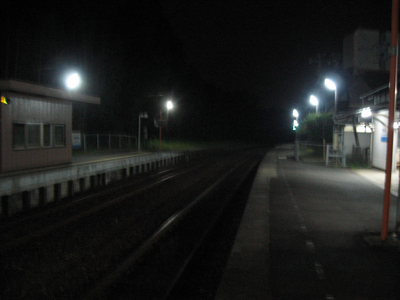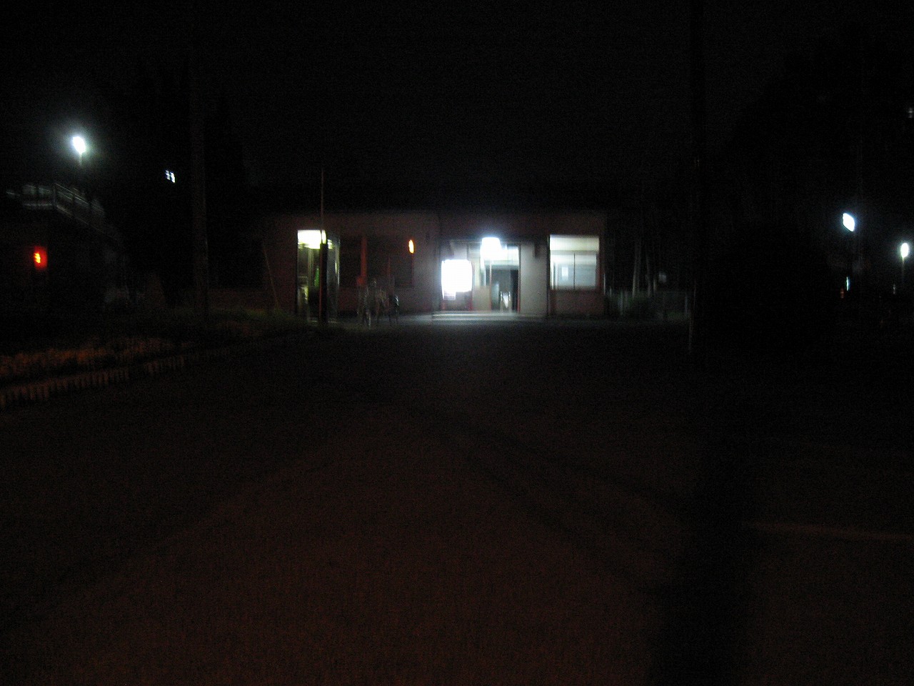 駅前はさびしい国道だった。肌寒さの中ナトリウムランプが点々とともり、死体でも投げ捨てられそうな感じだが、こういうひと気のない国道脇の木造駅舎には、夜間ほとんど人の来ないので、今日は安眠確定である。もっともバイパスが開通したので、今は旧国道2号だろうけど、元々はこちらがバイパスだったのだろう。それでも当時の国道の雰囲気や風格は今もかすかに残っている。