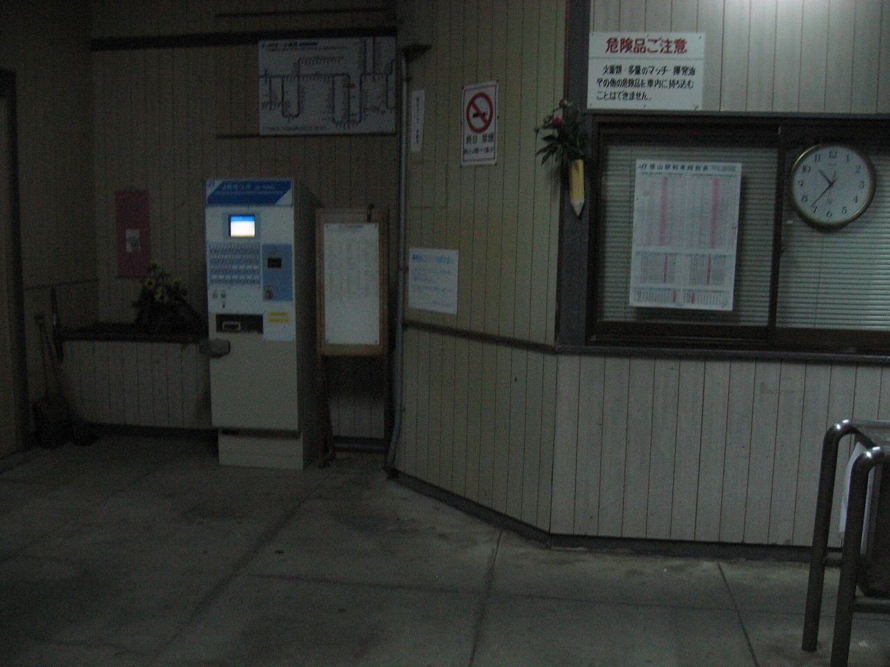 もう幾度となく見て見飽きたような、プリント合板の木造駅舎内は、無人駅三点セットともいうべきものがそろっている。斜めにしつらえられた旧窓口、生け花、券売機だ。長椅子があるのを真っ先に確認したのは言うまでもない。そしてそこにホームレスが居ついていないことも…