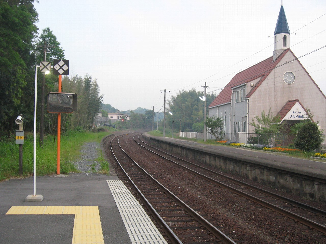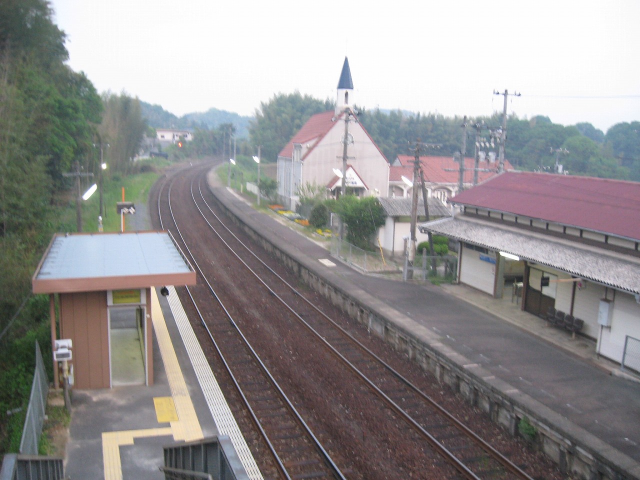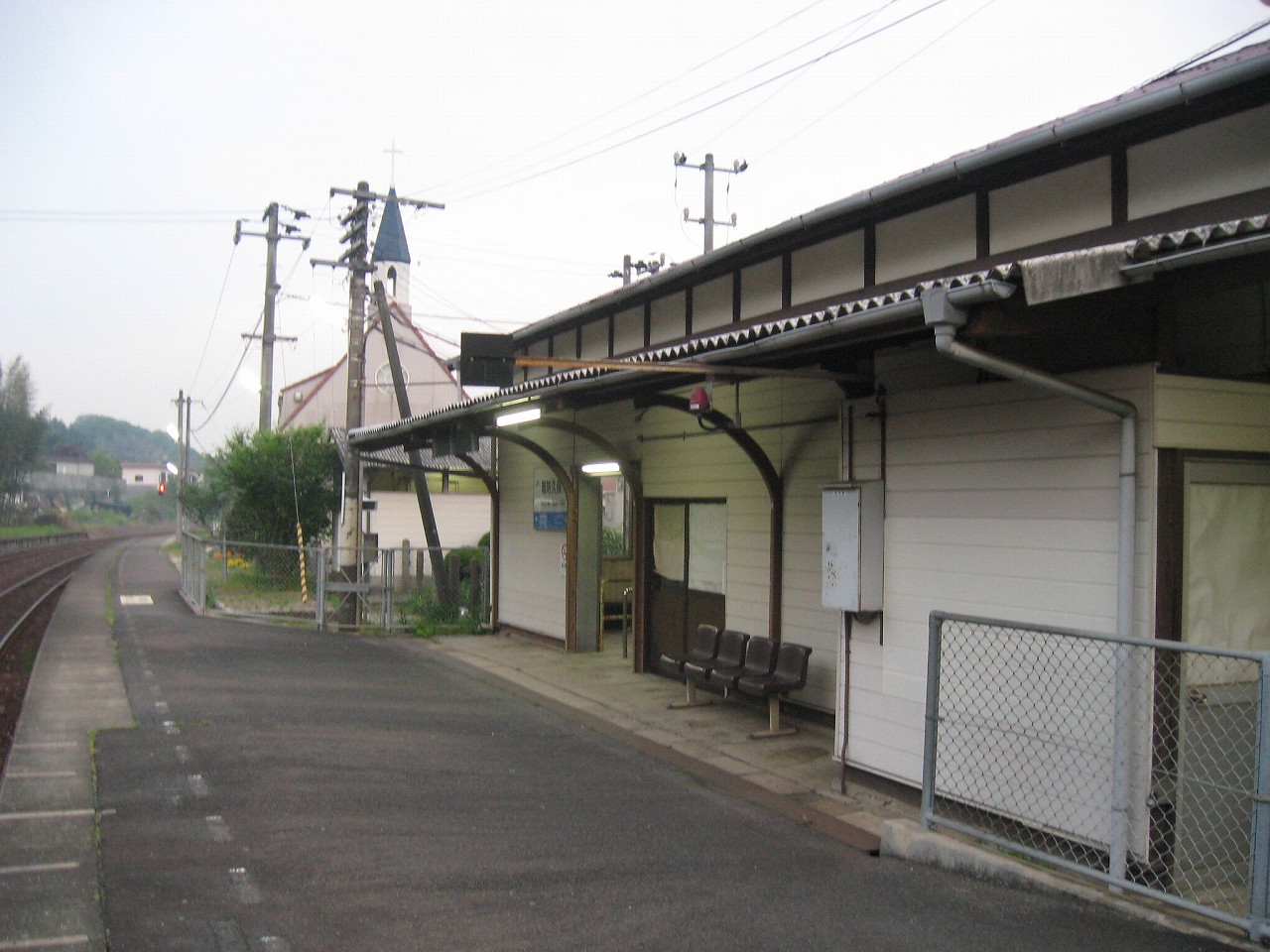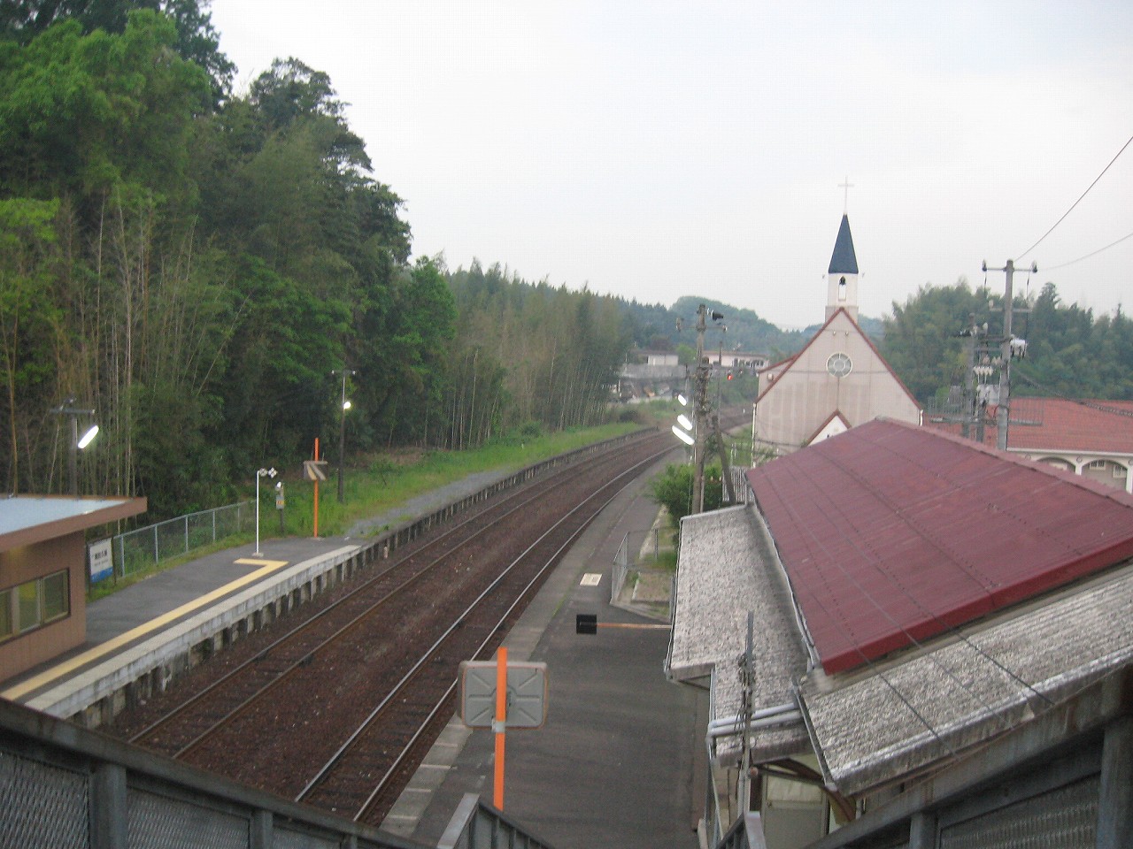 山手側のホーム降りると、教会の姿は異様で、なんでここにこんなものがあるんだといった感じだった。夢か幻か? 何度か僕は駅名標を確認した。そこにははっきりと感じで周防久保、とあり、まぎれもない日本、しかも山口である。 夢の薬でタイムスリップし、帰られないことに悲嘆に暮れて泣きはらしているといつしか大海になって帰り着いていた、そんな錯覚にも陥った。