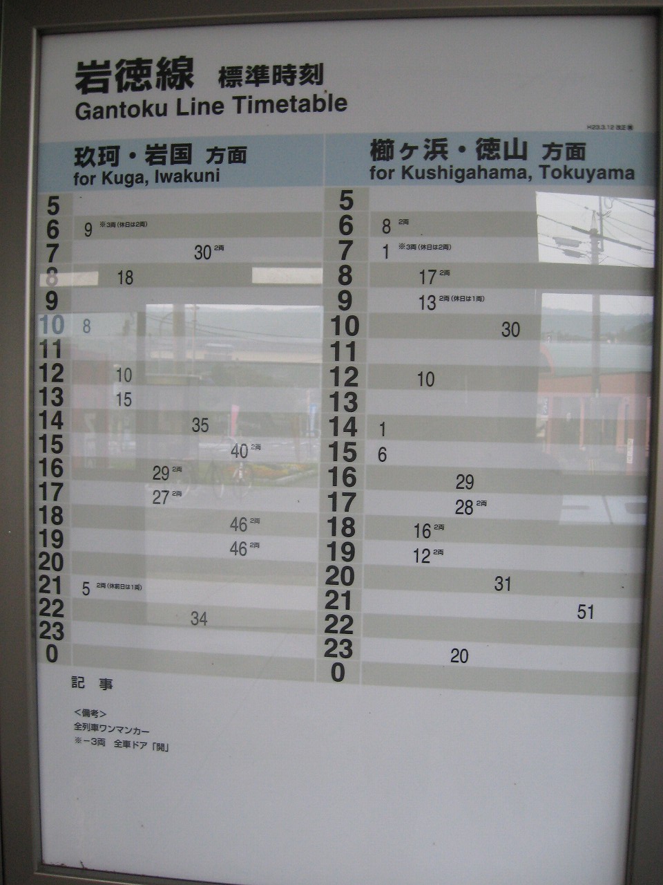 駅に戻り、ホームへ入る。特別に見えた聖ナルドのレグリーズは、ただ多少似合わない感じでそこにぼーっと突っ立っていて、ここもごくありきたりな駅へと、僕の眼には変容していった。 異様に薄い鞄にスーツ姿といういで古風な男性とともに、やってきた気動車に乗りこむ。車内に効いた暖房もまた、この地をを僕にとってごくありきたりなものへと変えてしまう。勤め人や津ヴ覚醒を送り届けるために、気温一定以下なので車内を温めている、それだけだ。こんな山村も、一つ一つ違う駅も、すべて均質化する。それが列車だ。 一緒に乗った男の人のようなのは、昨日徳山の車内でいくらも見かけた気がする。たいていみんなカバンが、飾り物みたいに薄かった。尤も、家に資料を持ち帰りができる時代でもない。しかし僕にはふと、浪平のデスクが思い浮かぶ。電話と紙一枚しかないといったような…