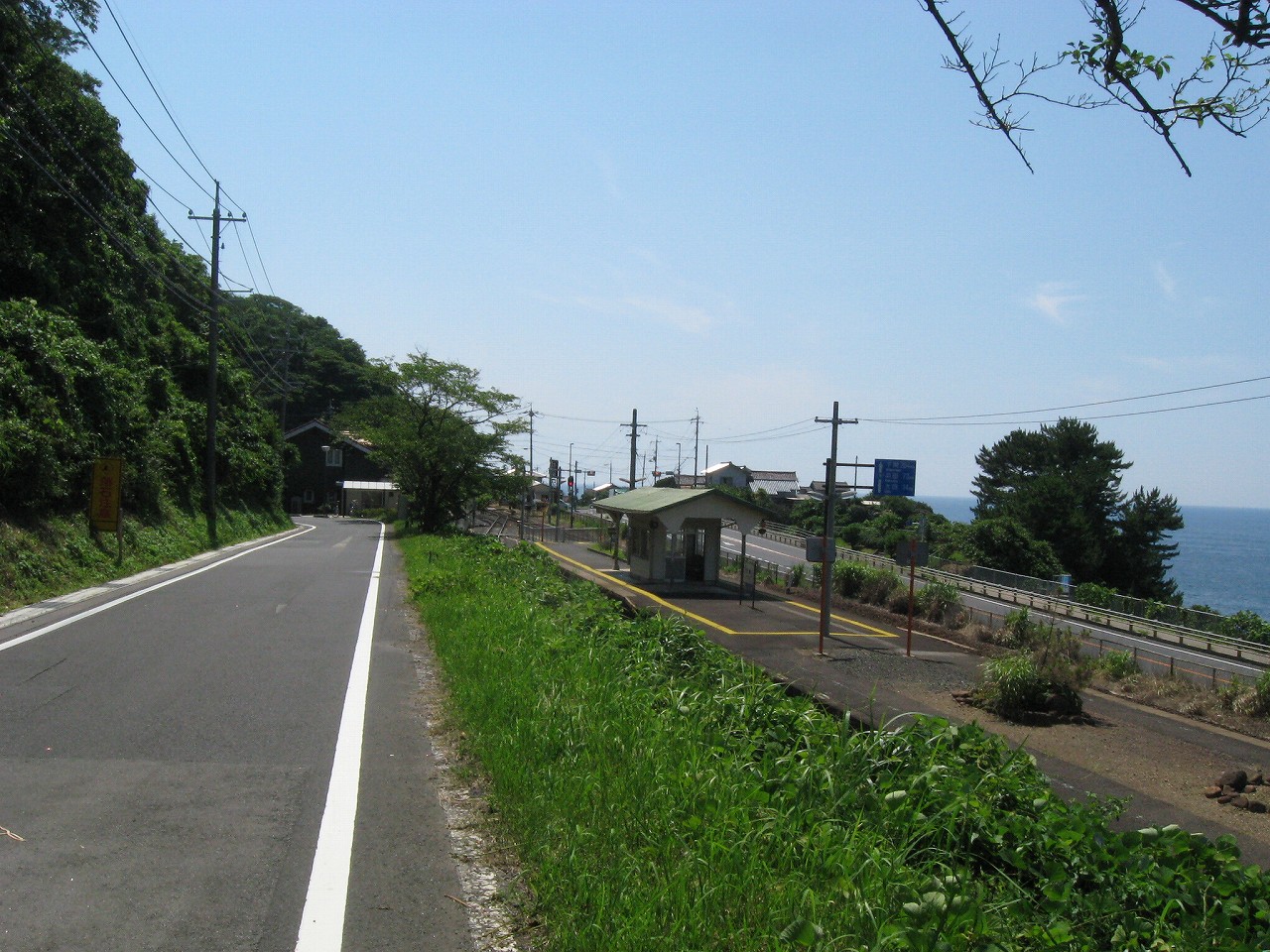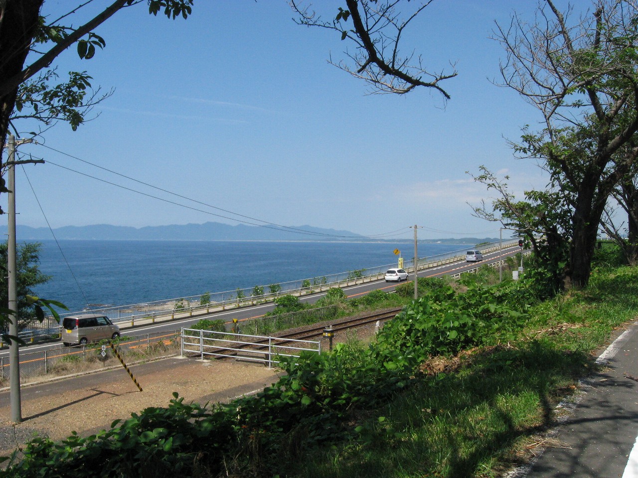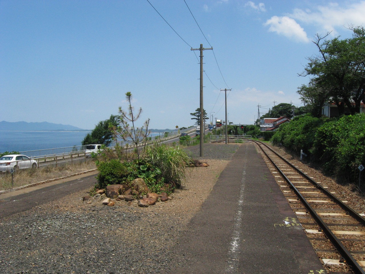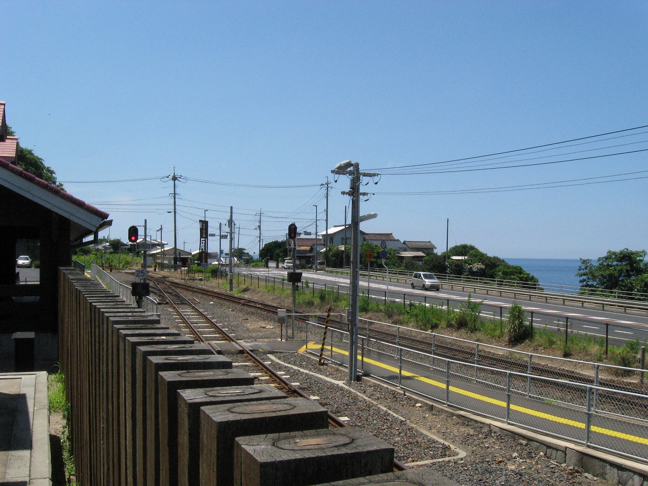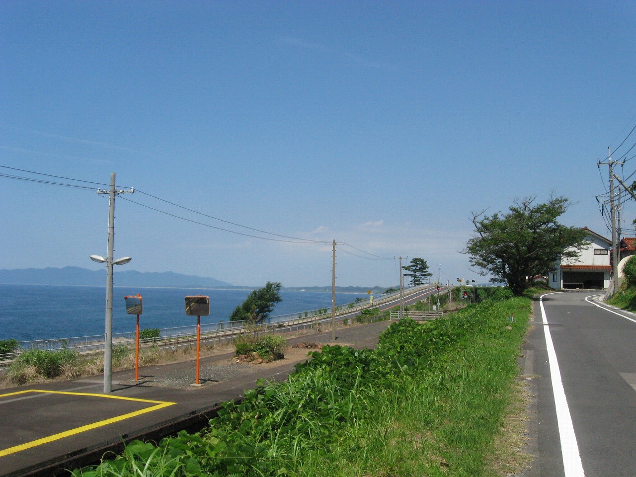 線路の間の通路を歩いて構内踏切に至るが、横に国道があるのに、そこに出られないのが何か不思議で、混乱した。いまだに僕はここの地形を完全に理解できないでいる。それはこの辺り一帯の「浮遊感」だろう。国道も鉄道の路盤も、なんか浮いてる感じがするのだ。海が下方にあるためだけど、この地平が大規模な高架の上にあるような、そんな感じがしてしまうくせい、なにか造りものめいている、なのに、きっとほとんどは天然なのだ。