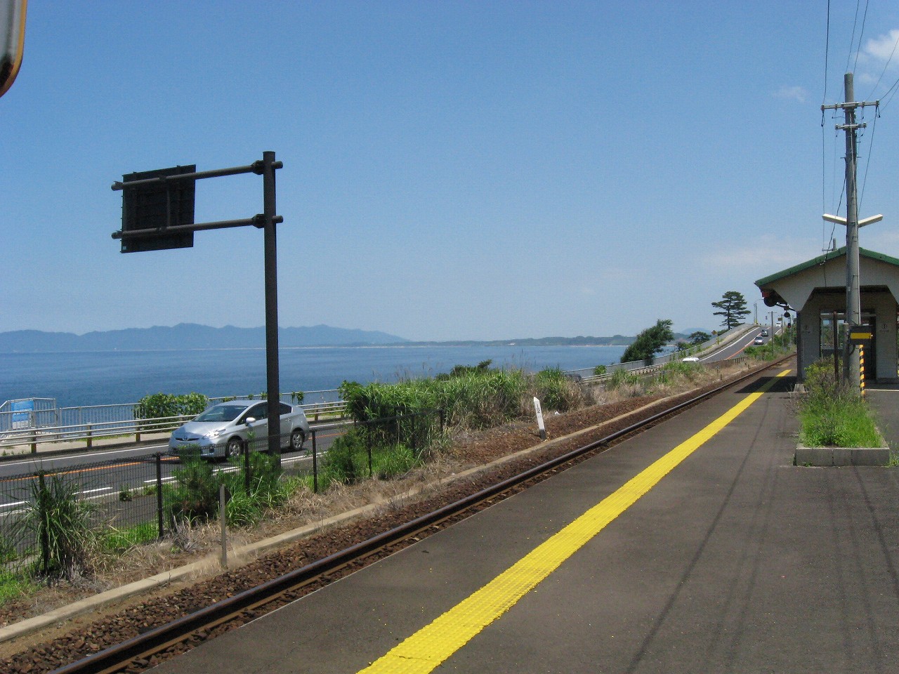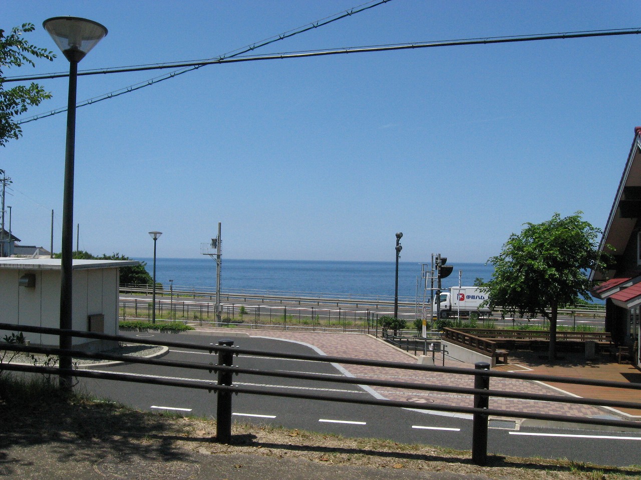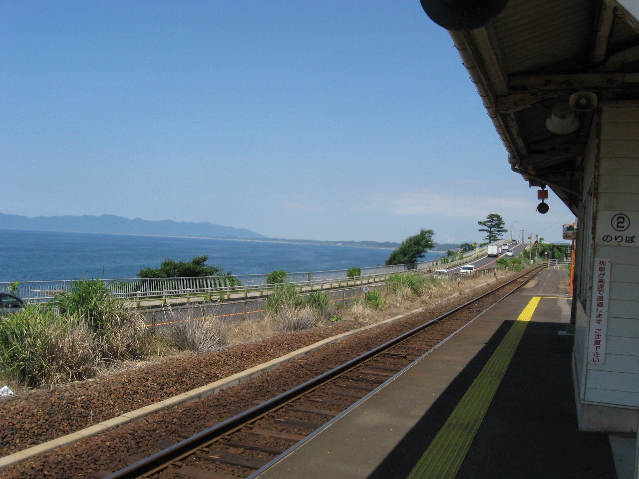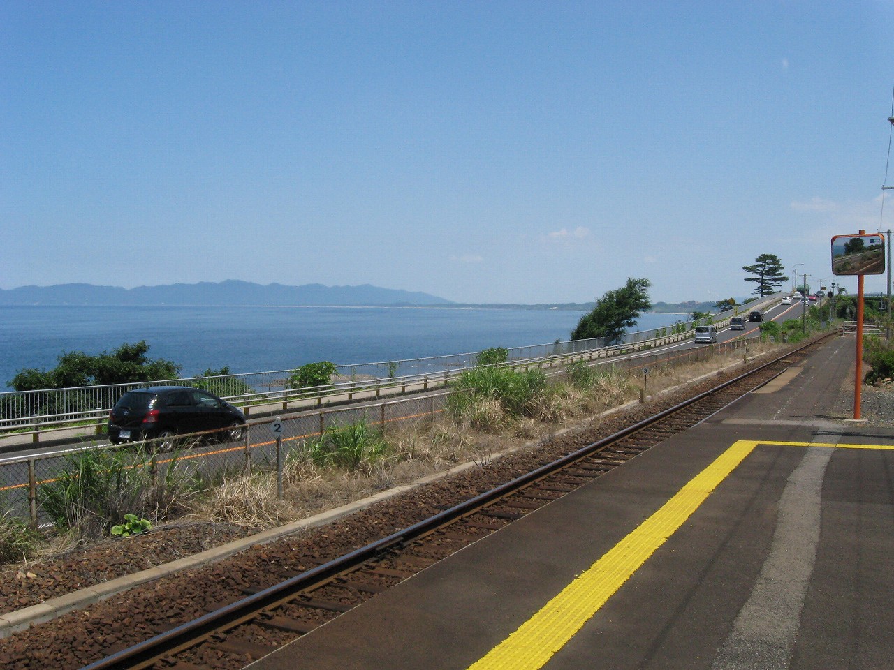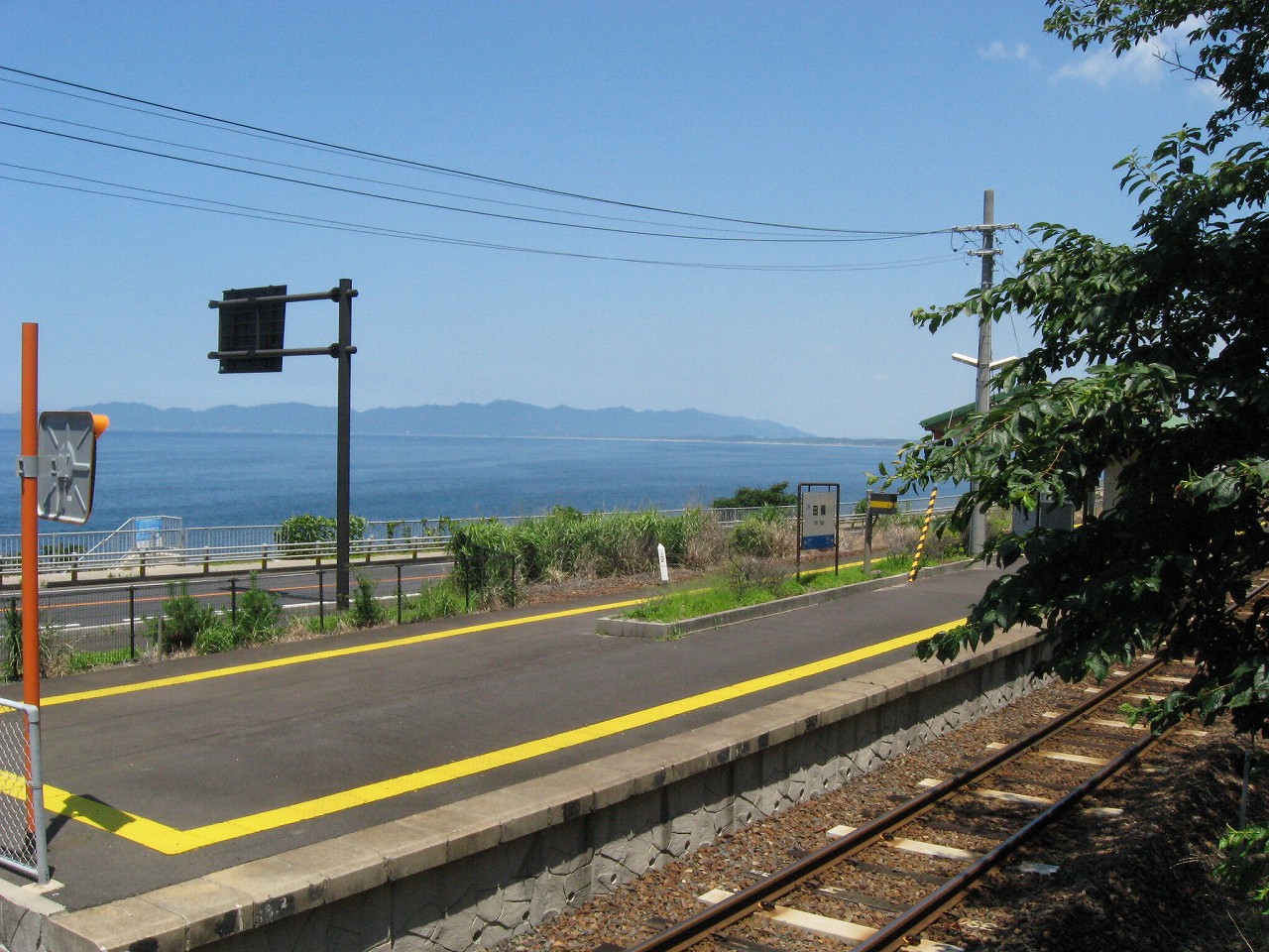 線路の間の通路を歩いて構内踏切に至るが、横に国道があるのに、そこに出られないのが何か不思議で、混乱した。いまだに僕はここの地形を完全に理解できないでいる。それはこの辺り一帯の「浮遊感」だろう。国道も鉄道の路盤も、なんか浮いてる感じがするのだ。海が下方にあるためだけど、この地平が大規模な高架の上にあるような、そんな感じがしてしまうくせい、なにか造りものめいている、なのに、きっとほとんどは天然なのだ。