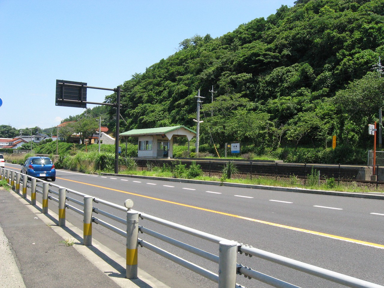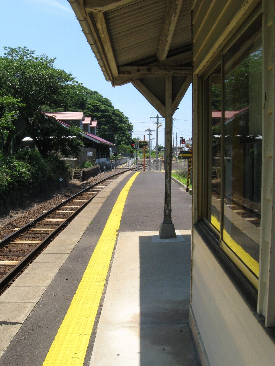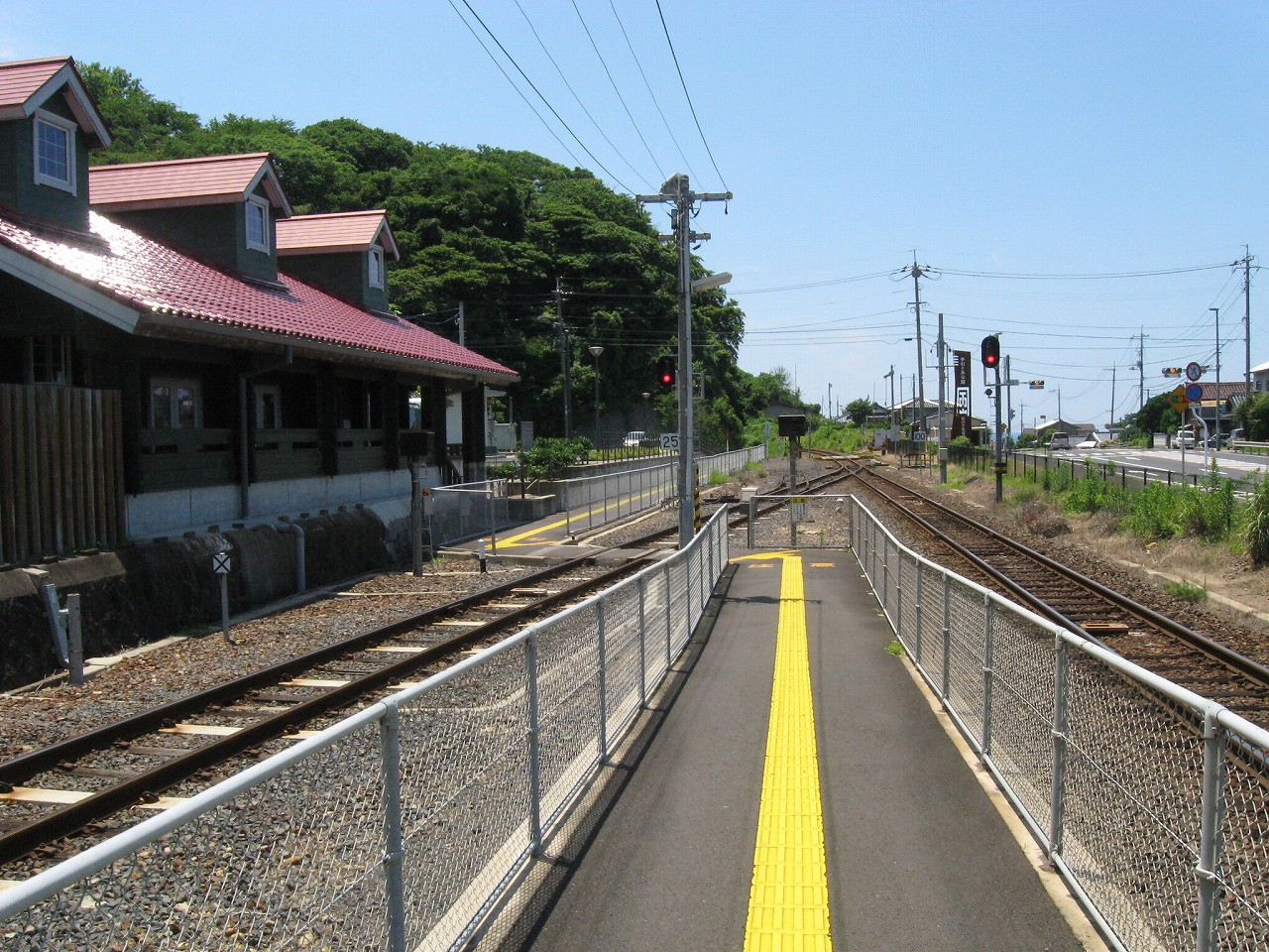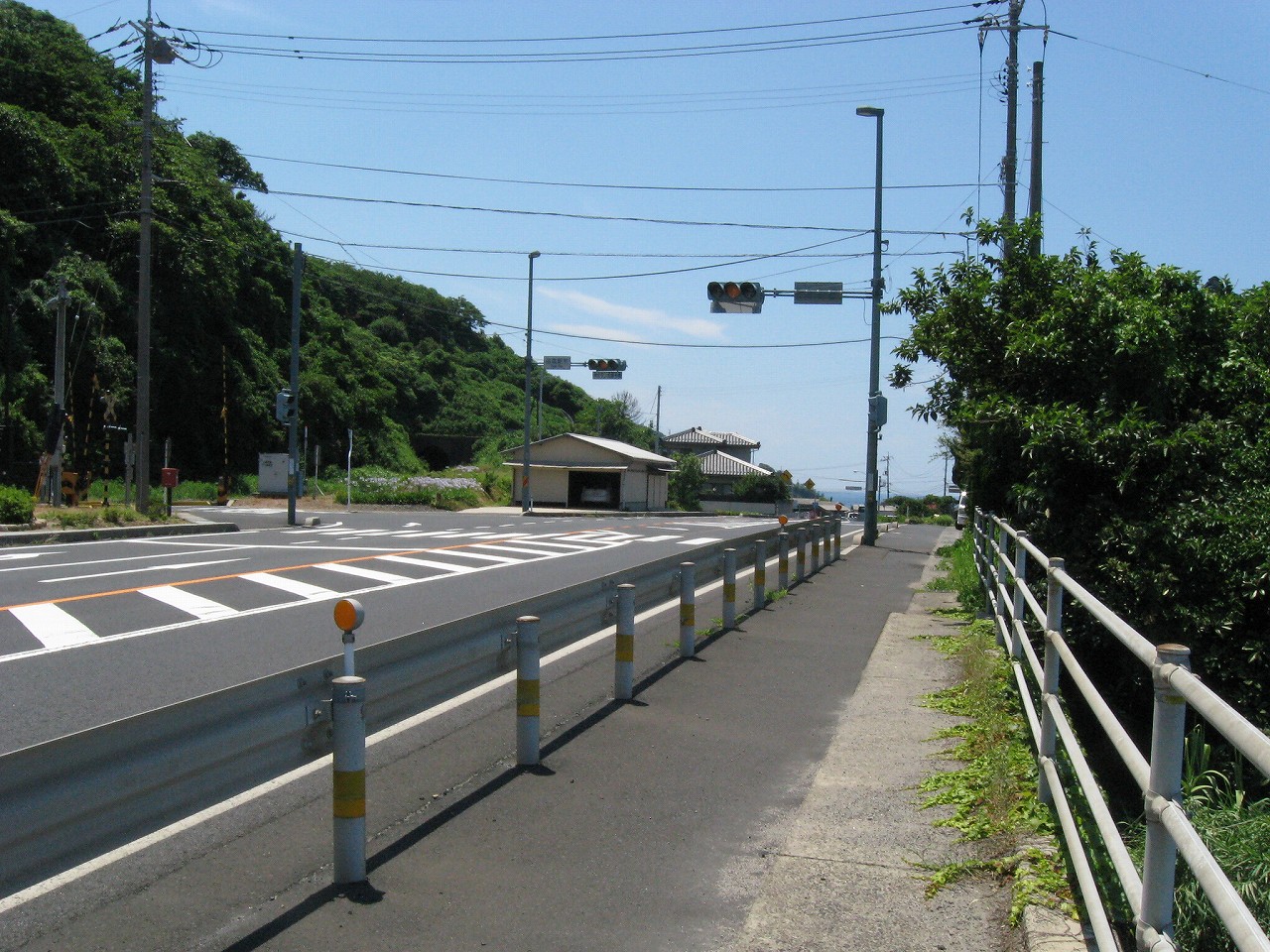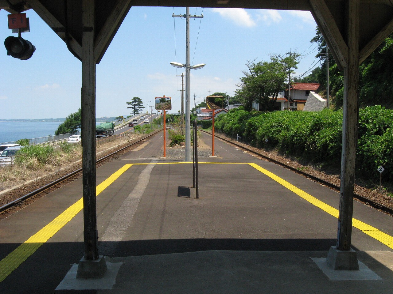 線路の間の通路を歩いて構内踏切に至るが、横に国道があるのに、そこに出られないのが何か不思議で、混乱した。いまだに僕はここの地形を完全に理解できないでいる。それはこの辺り一帯の「浮遊感」だろう。国道も鉄道の路盤も、なんか浮いてる感じがするのだ。海が下方にあるためだけど、この地平が大規模な高架の上にあるような、そんな感じがしてしまうくせい、なにか造りものめいている、なのに、きっとほとんどは天然なのだ。