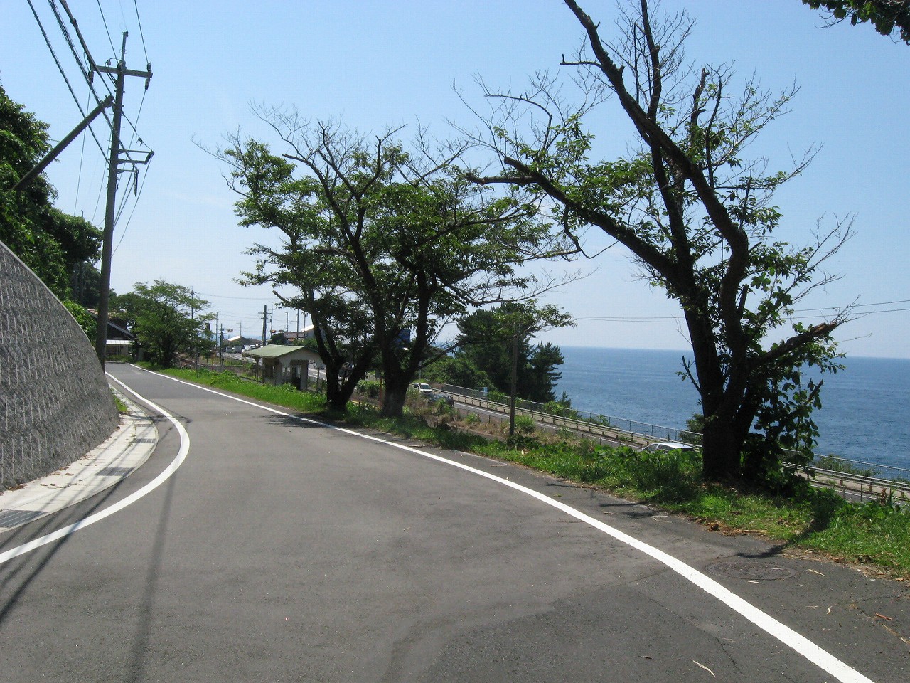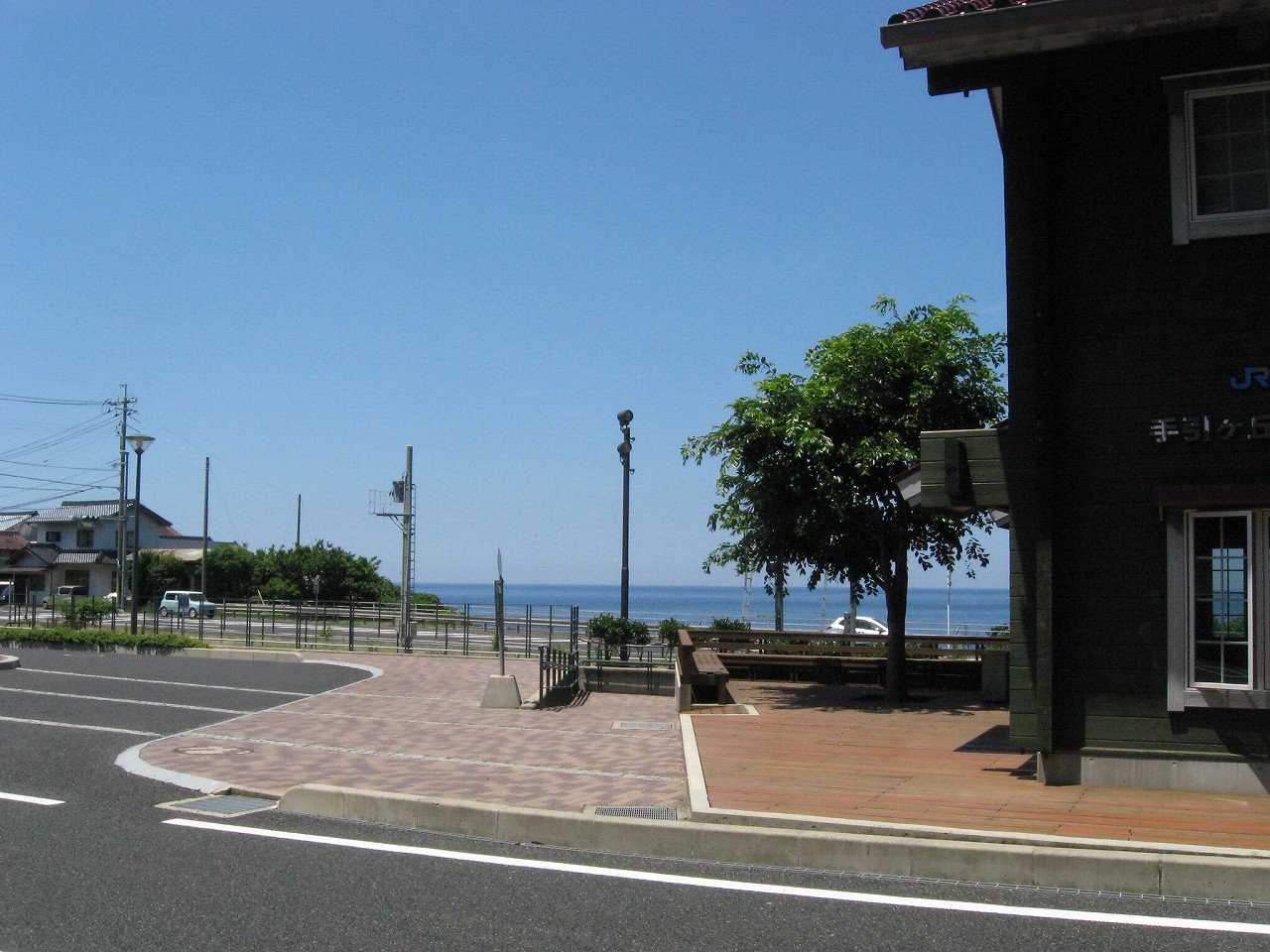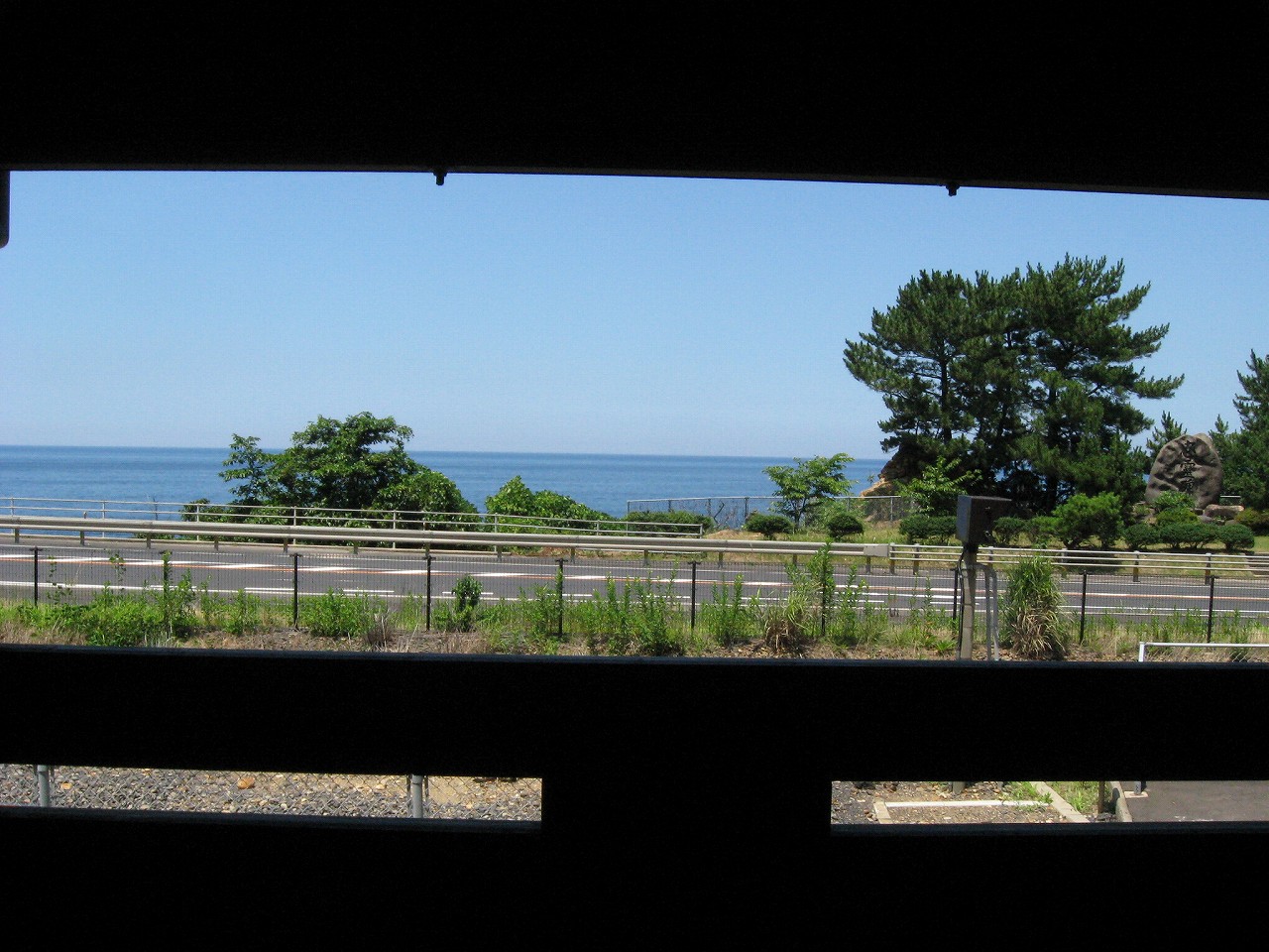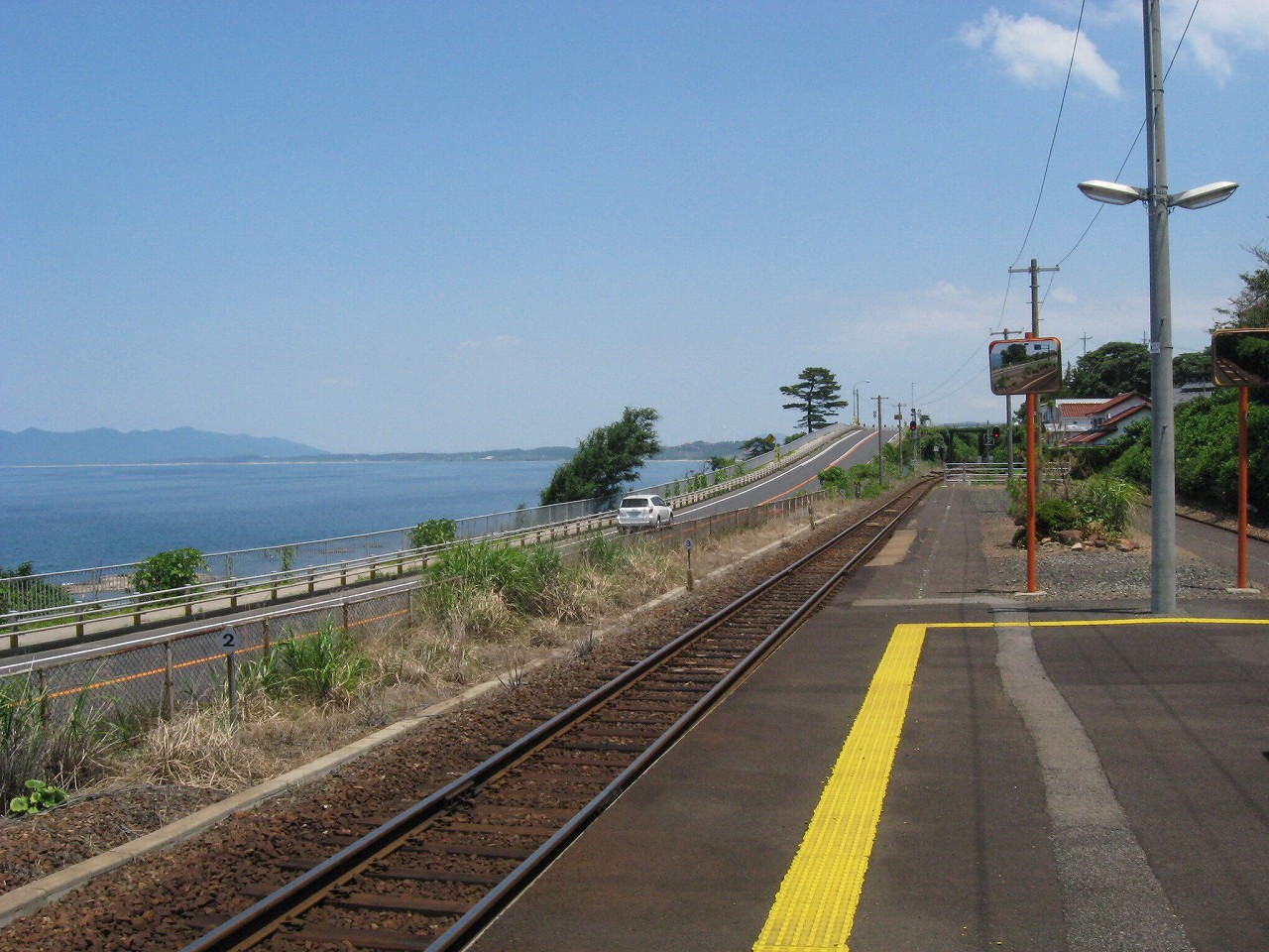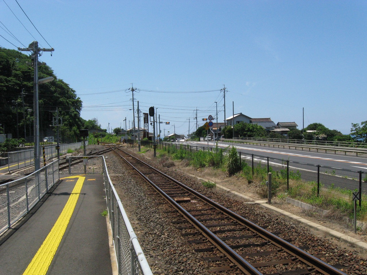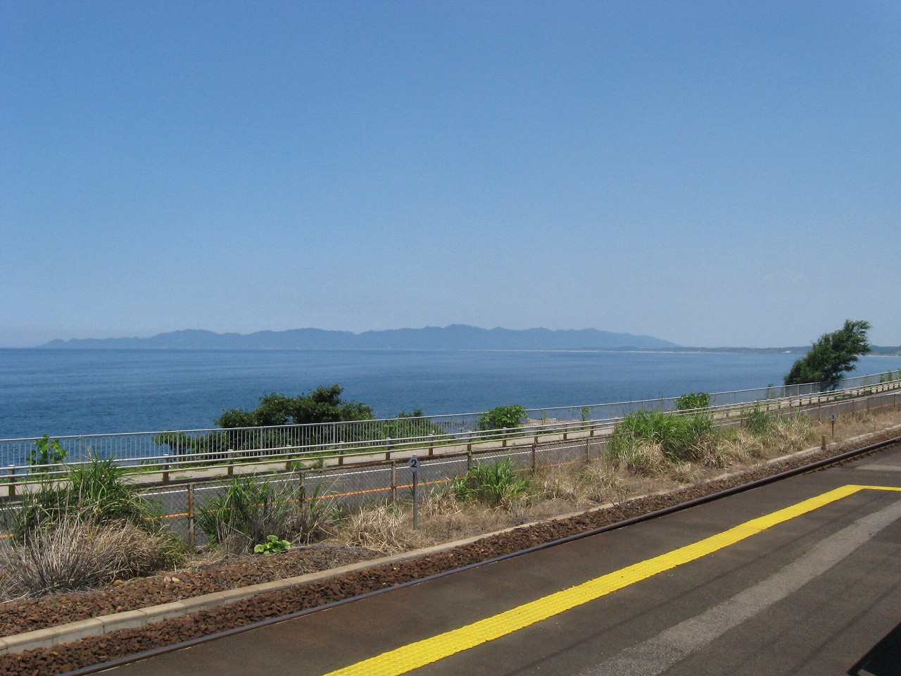 線路の間の通路を歩いて構内踏切に至るが、横に国道があるのに、そこに出られないのが何か不思議で、混乱した。いまだに僕はここの地形を完全に理解できないでいる。それはこの辺り一帯の「浮遊感」だろう。国道も鉄道の路盤も、なんか浮いてる感じがするのだ。海が下方にあるためだけど、この地平が大規模な高架の上にあるような、そんな感じがしてしまうくせい、なにか造りものめいている、なのに、きっとほとんどは天然なのだ。