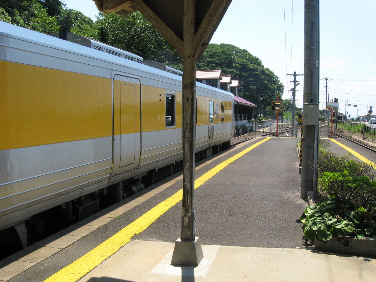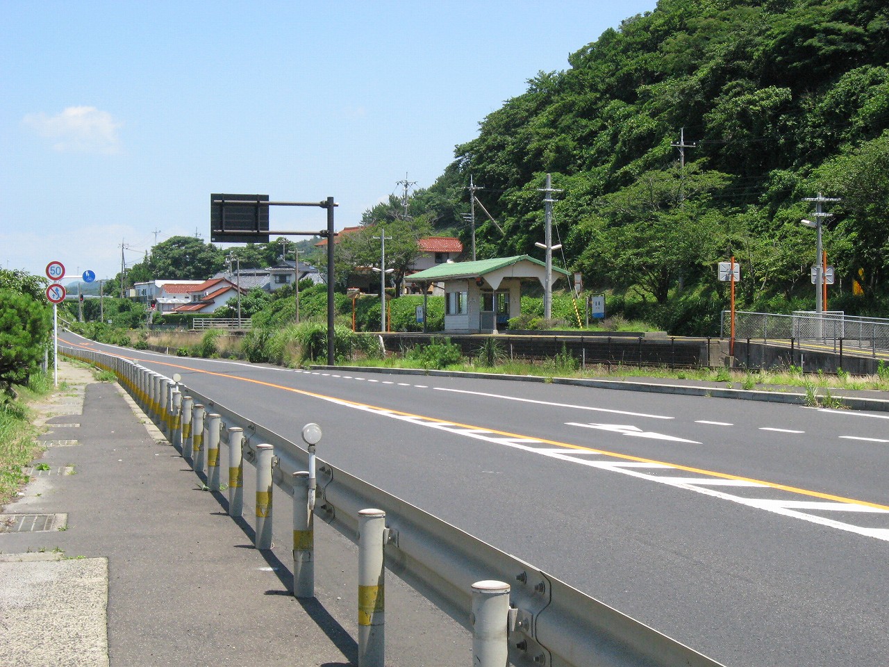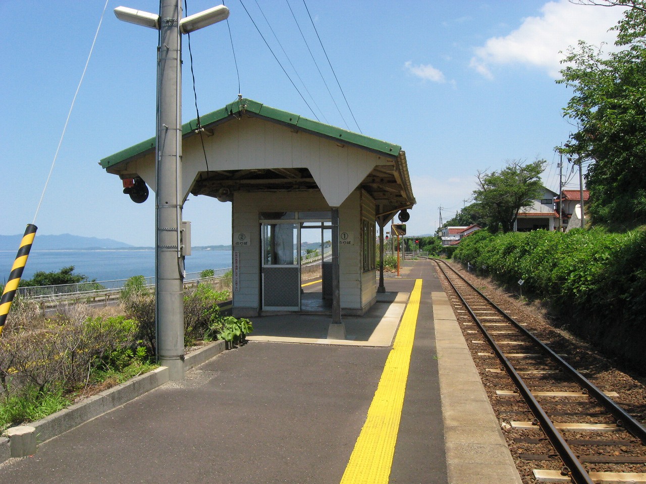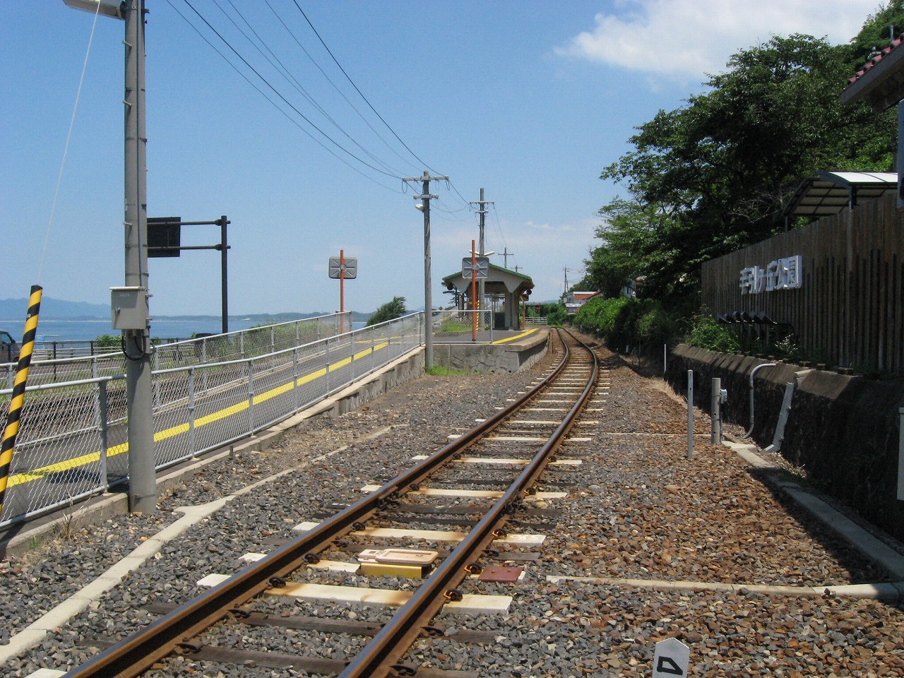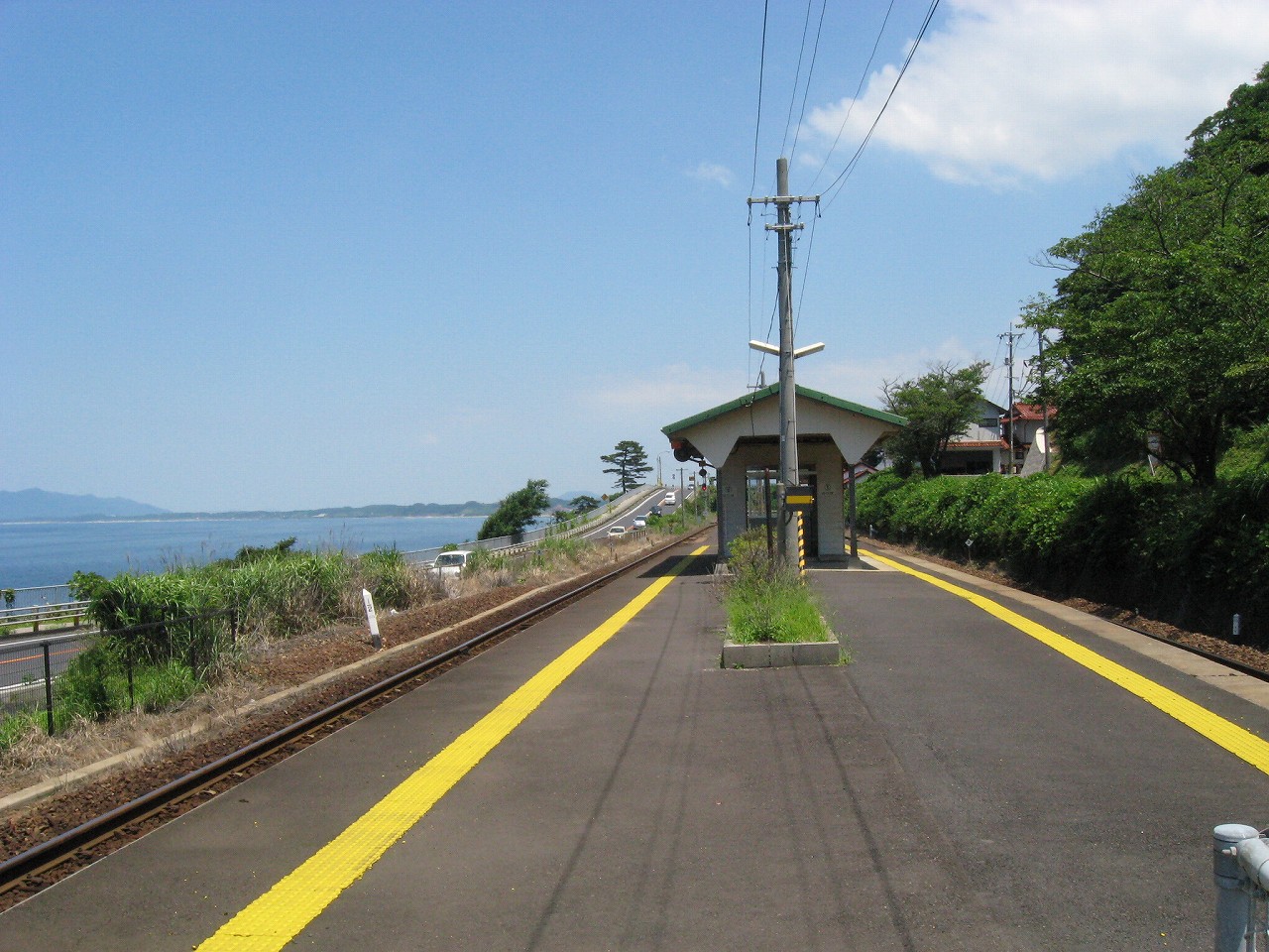 線路の間の通路を歩いて構内踏切に至るが、横に国道があるのに、そこに出られないのが何か不思議で、混乱した。いまだに僕はここの地形を完全に理解できないでいる。それはこの辺り一帯の「浮遊感」だろう。国道も鉄道の路盤も、なんか浮いてる感じがするのだ。海が下方にあるためだけど、この地平が大規模な高架の上にあるような、そんな感じがしてしまうくせい、なにか造りものめいている、なのに、きっとほとんどは天然なのだ。