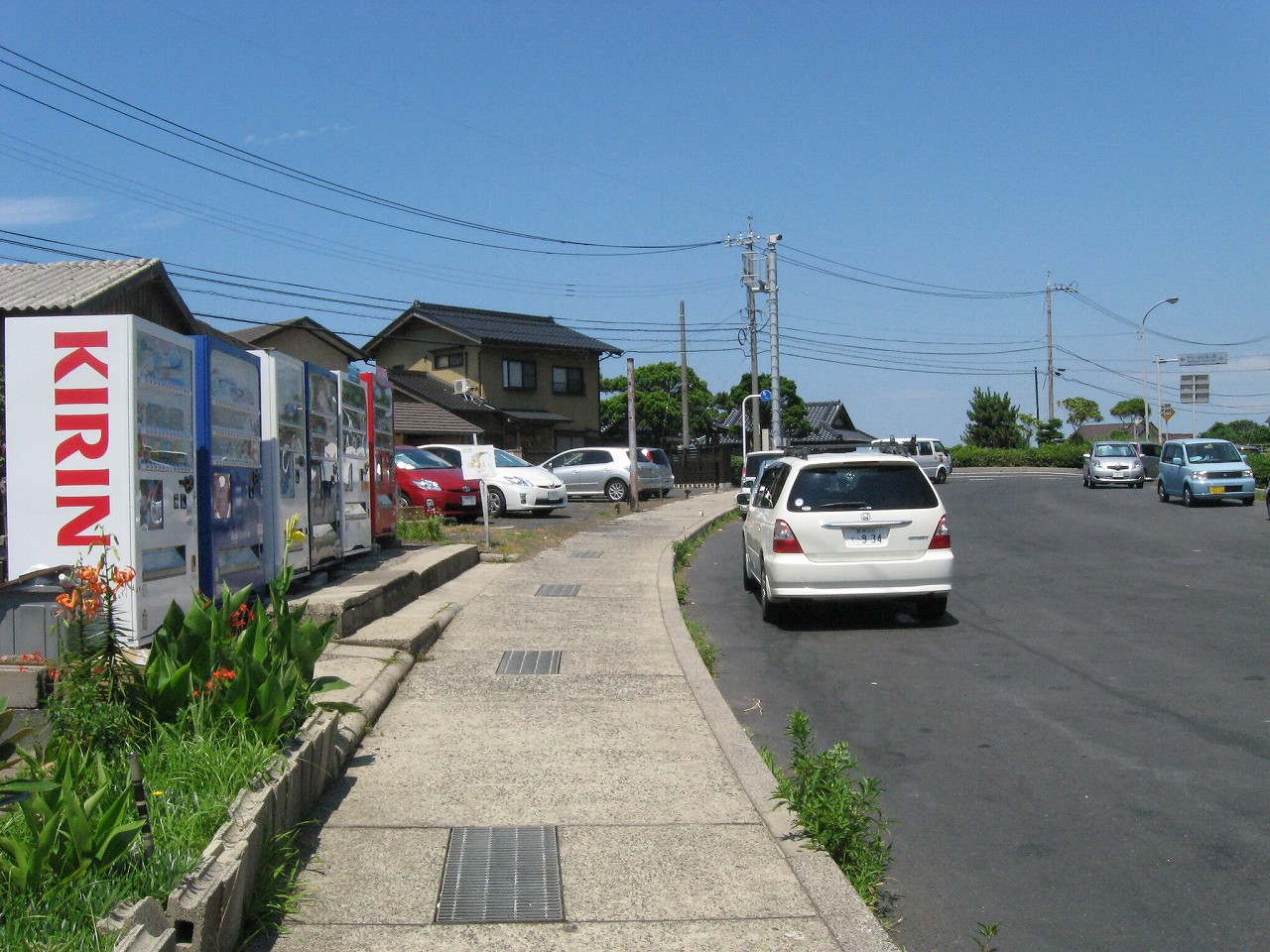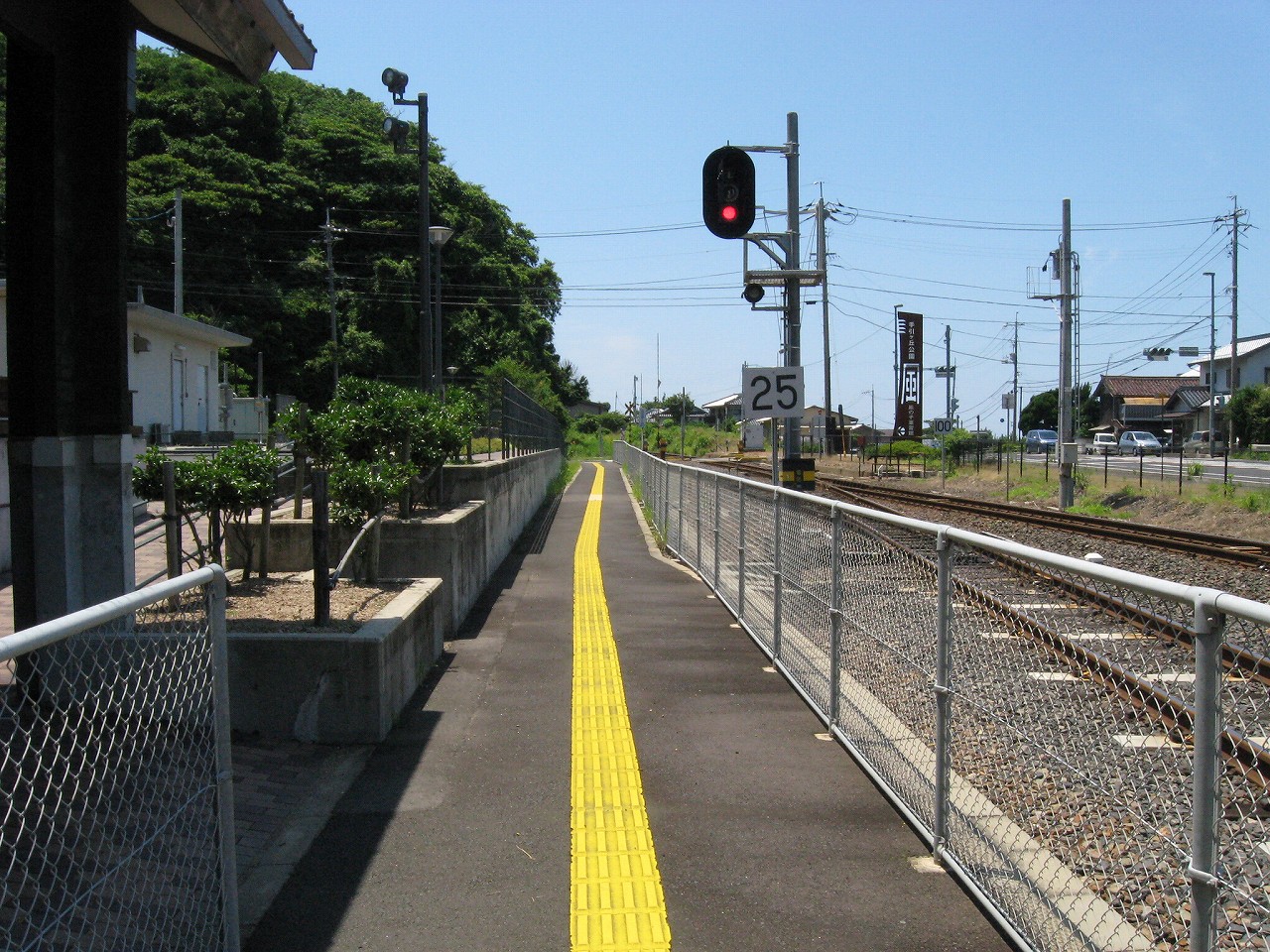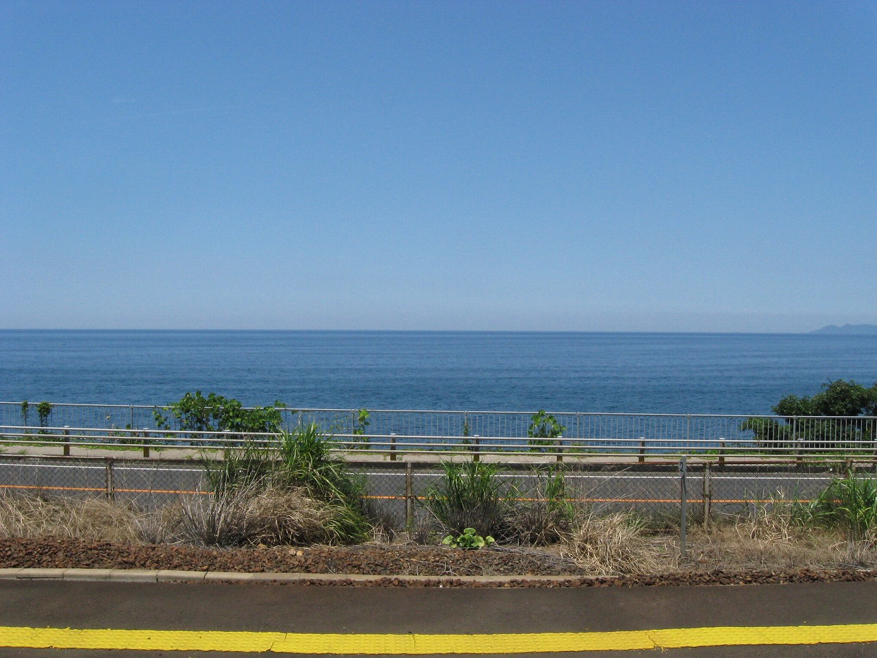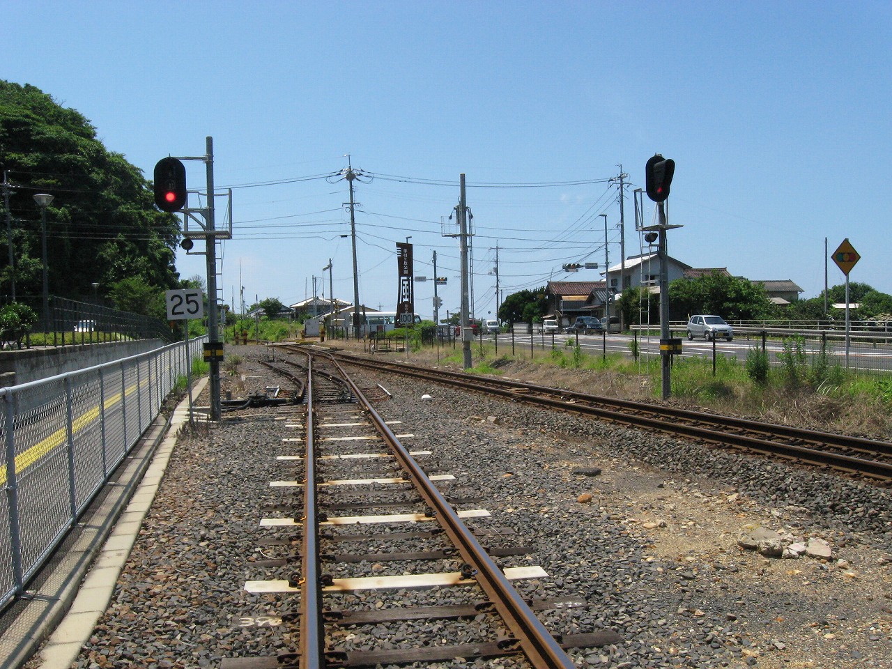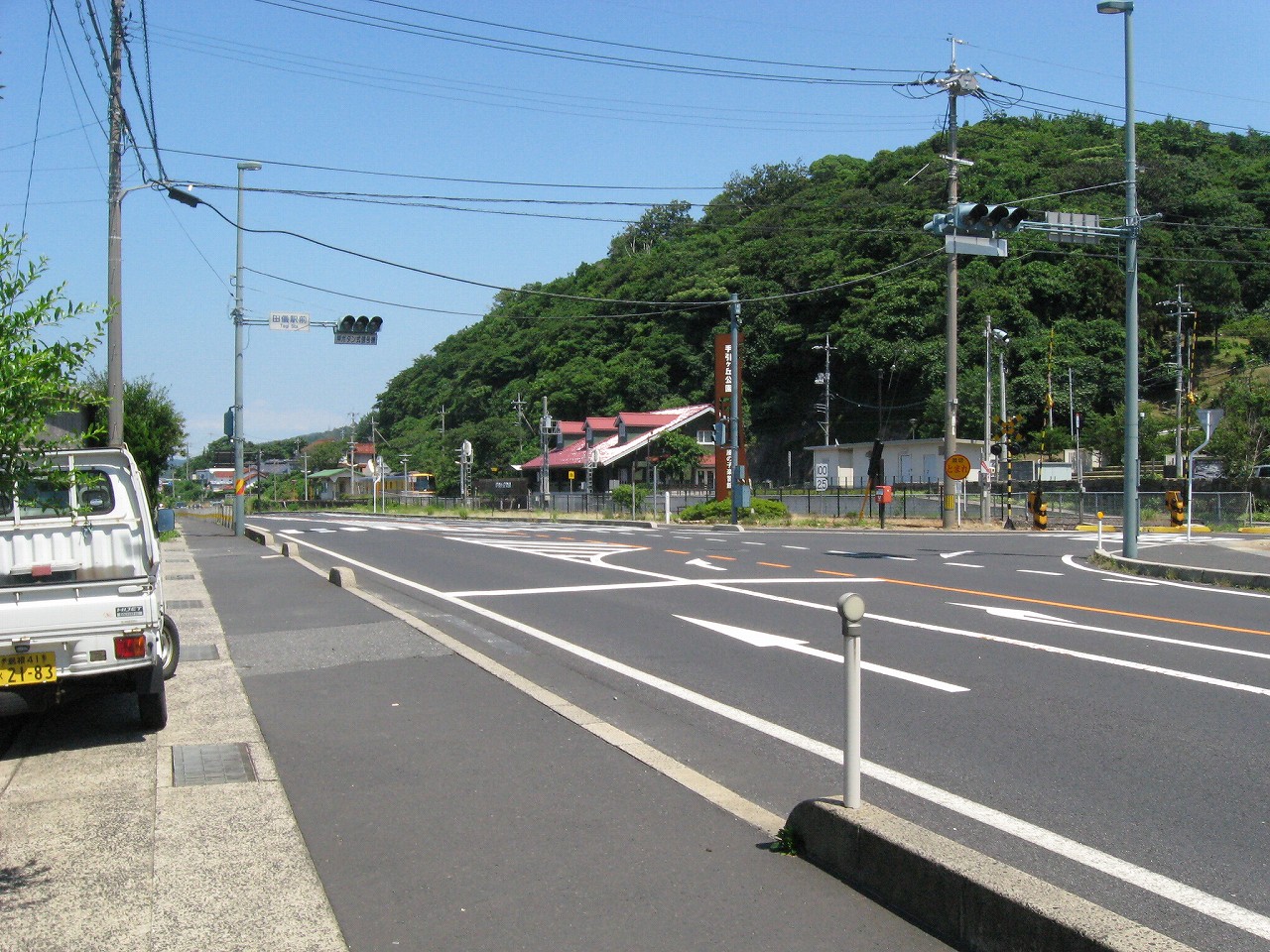 線路の間の通路を歩いて構内踏切に至るが、横に国道があるのに、そこに出られないのが何か不思議で、混乱した。いまだに僕はここの地形を完全に理解できないでいる。それはこの辺り一帯の「浮遊感」だろう。国道も鉄道の路盤も、なんか浮いてる感じがするのだ。海が下方にあるためだけど、この地平が大規模な高架の上にあるような、そんな感じがしてしまうくせい、なにか造りものめいている、なのに、きっとほとんどは天然なのだ。