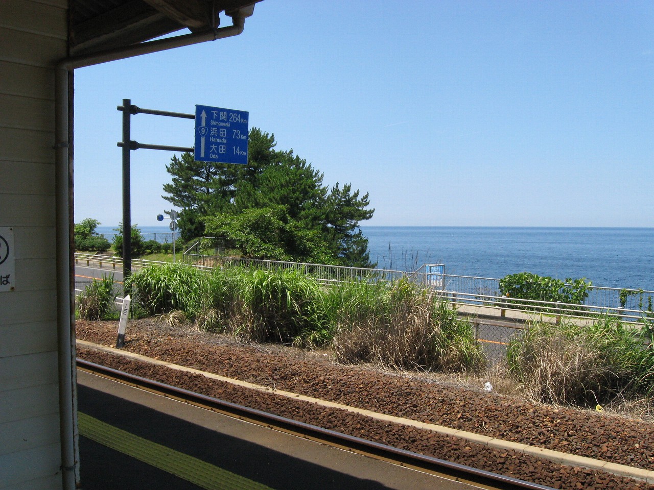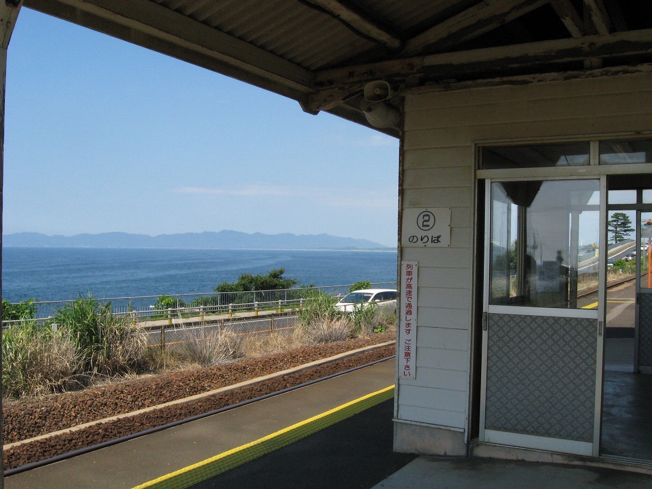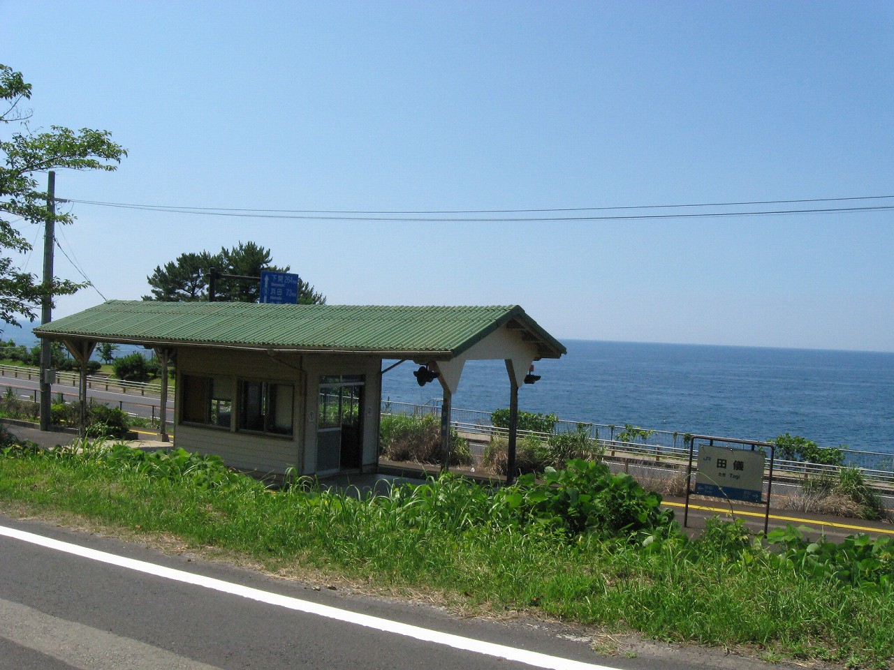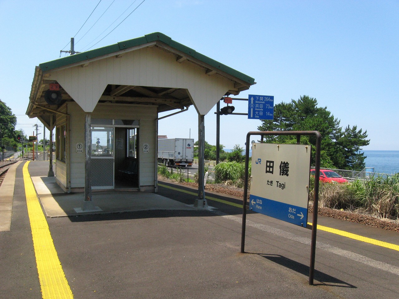 いくつものトンネルを抜けると、ようやく海辺にありながらどうにか開けたところに出てくる。そこが田儀だ。するとどうだろう、これまでの車窓で何度も、途中で降りられたらな、と思っていた海の間近な車窓が、駅を伴っているのだ! もう簡単に言ってしまうと、海を見下ろすめっちゃ眺めのいい駅に着きそうってこと! すっかり帰るつもりをしていたけど、これを見てやり過ごすというのは、不可能だった。もうなにか夢遊病者のように頭をぼんやりさせながら気もそぞろに運転台まで歩いていて、車内での改札のための列をつないでいた。