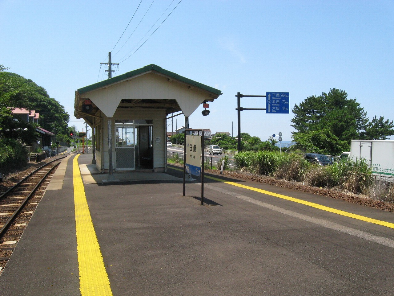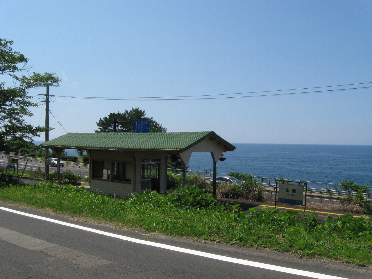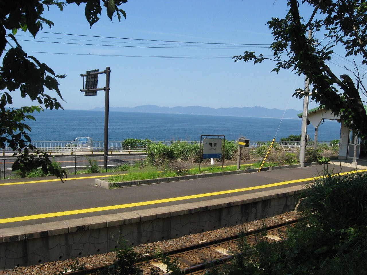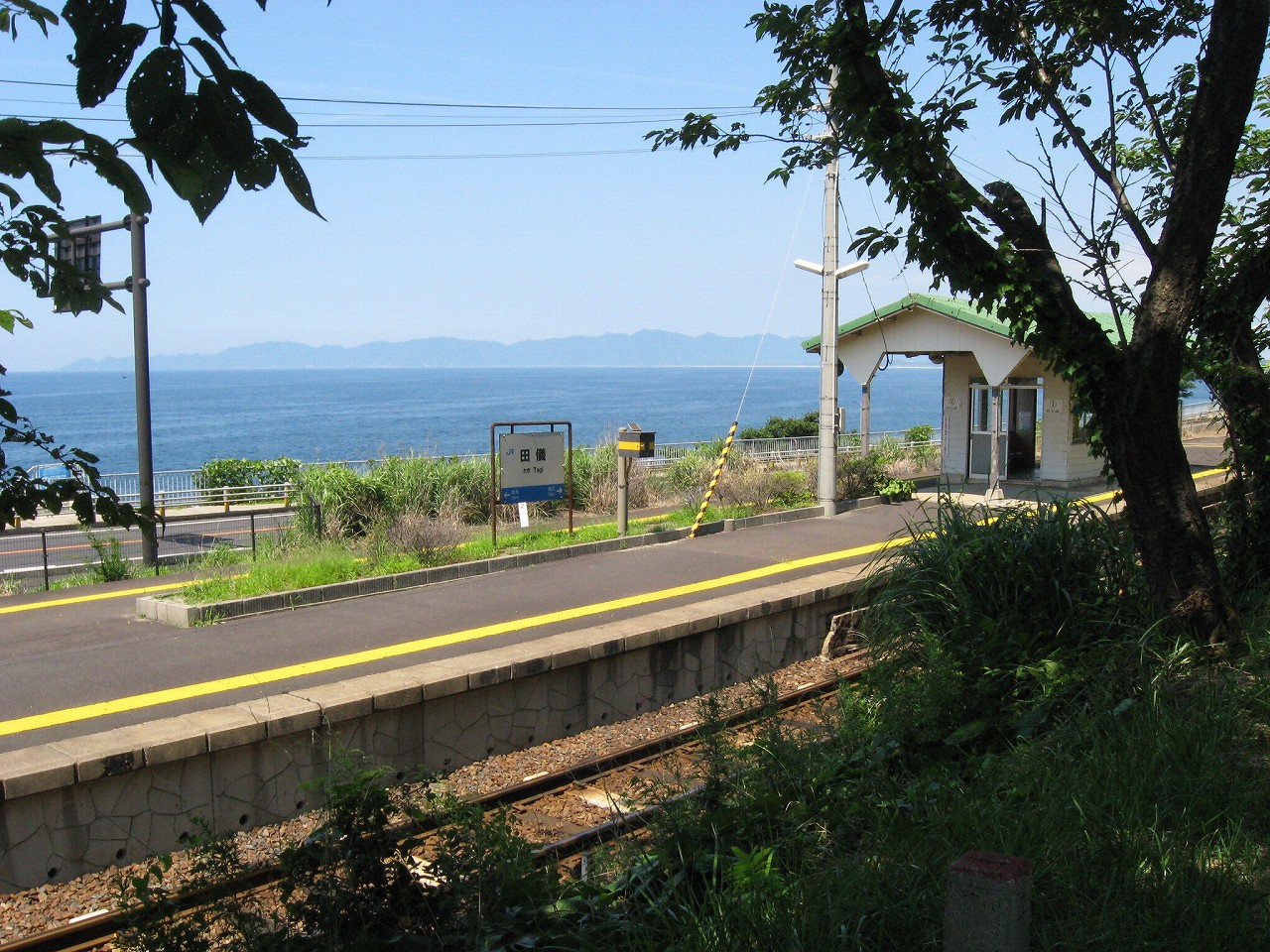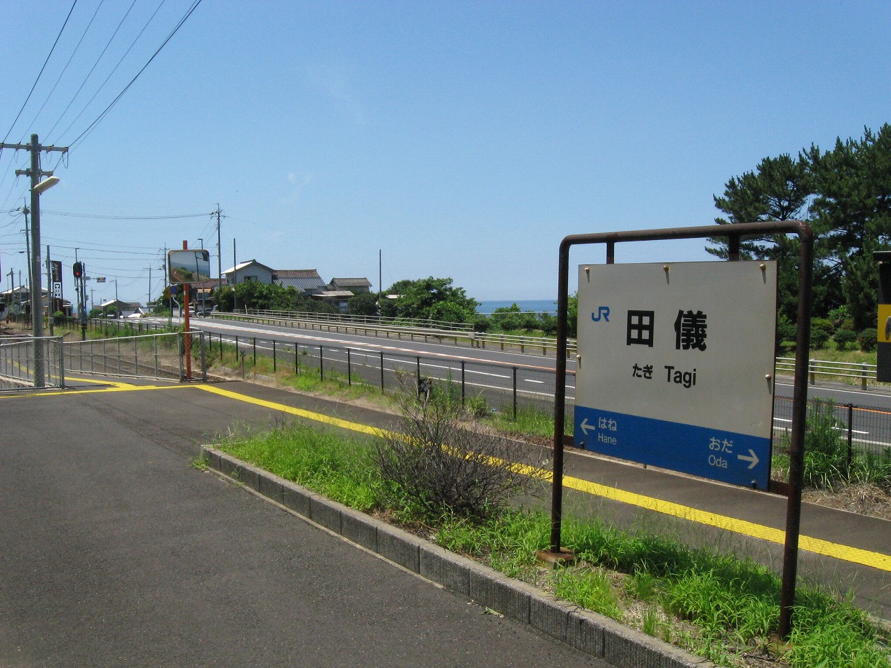 いくつものトンネルを抜けると、ようやく海辺にありながらどうにか開けたところに出てくる。そこが田儀だ。するとどうだろう、これまでの車窓で何度も、途中で降りられたらな、と思っていた海の間近な車窓が、駅を伴っているのだ! もう簡単に言ってしまうと、海を見下ろすめっちゃ眺めのいい駅に着きそうってこと! すっかり帰るつもりをしていたけど、これを見てやり過ごすというのは、不可能だった。もうなにか夢遊病者のように頭をぼんやりさせながら気もそぞろに運転台まで歩いていて、車内での改札のための列をつないでいた。