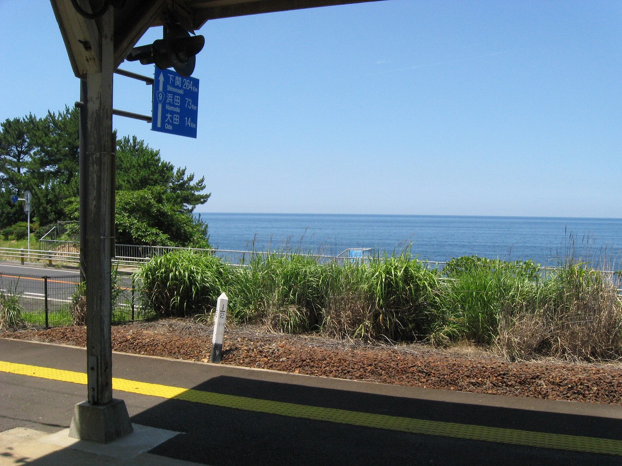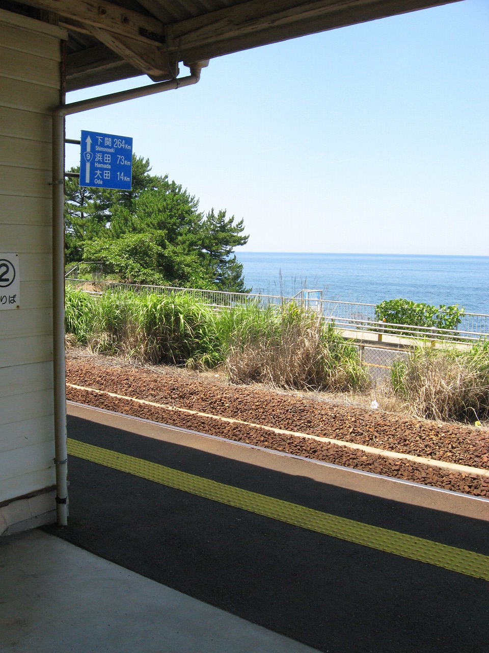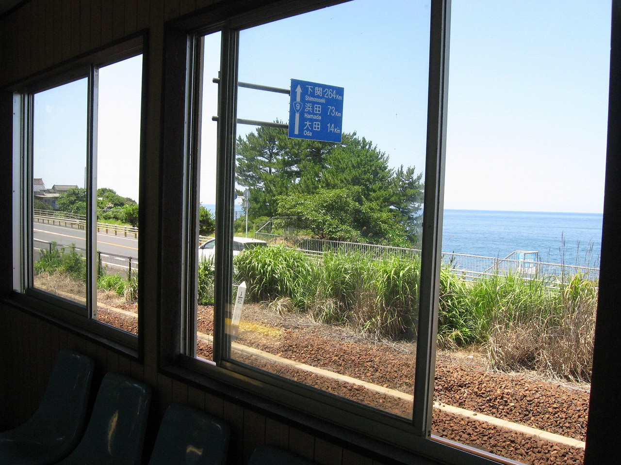 ホームは島式一つで、隣には国道9号か走っているという、なんか断崖の狭い平地をギリギリ使っているという感じだ。なので静かではないし、解放感もある。けれどもホームの待合室は旧駅舎時代のもので、国道に比して、ここだけは全く別の時間が流れているみたいだった。
