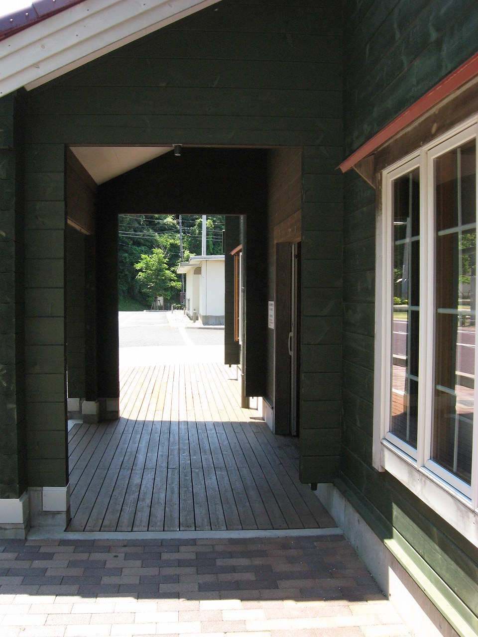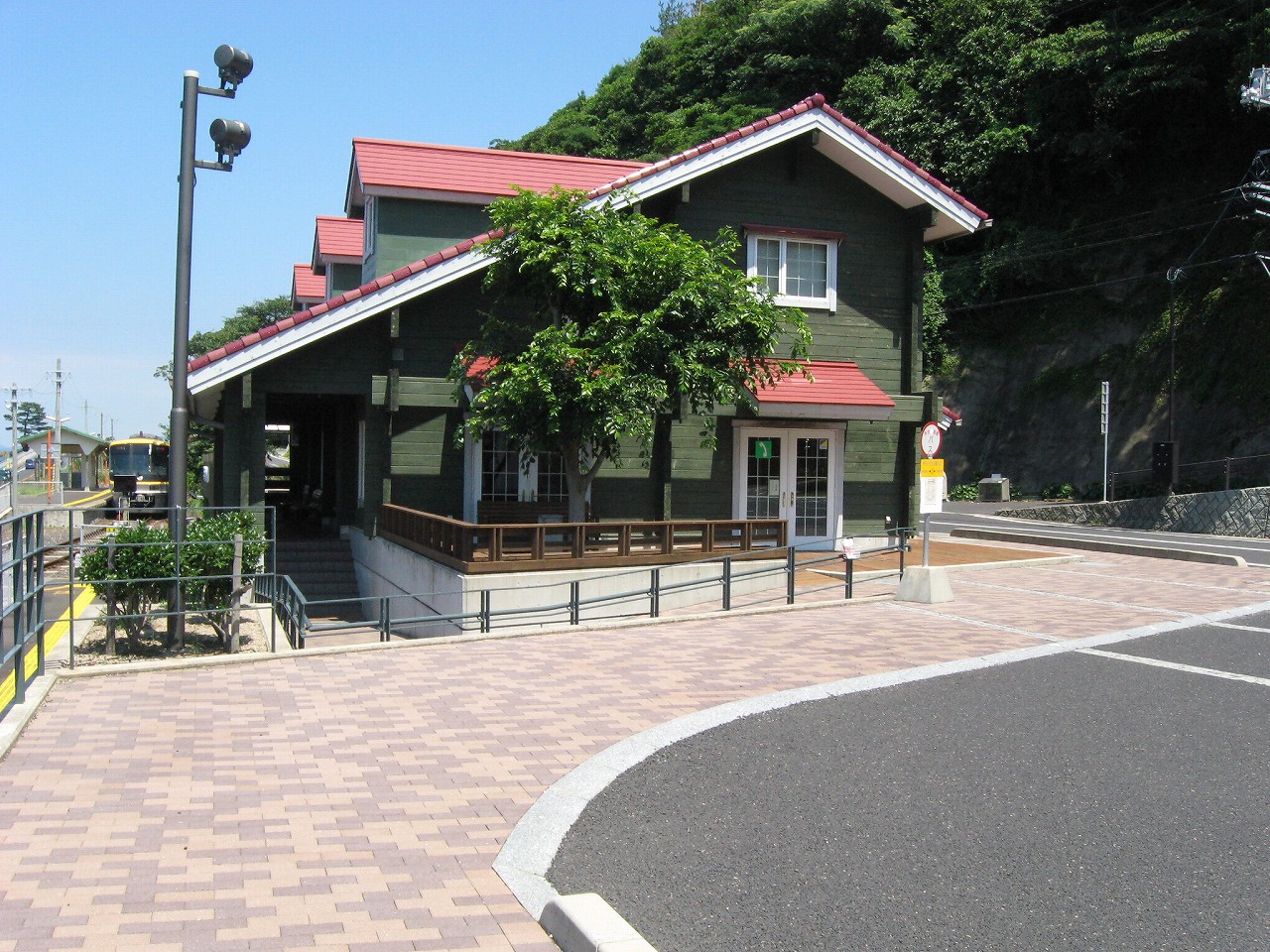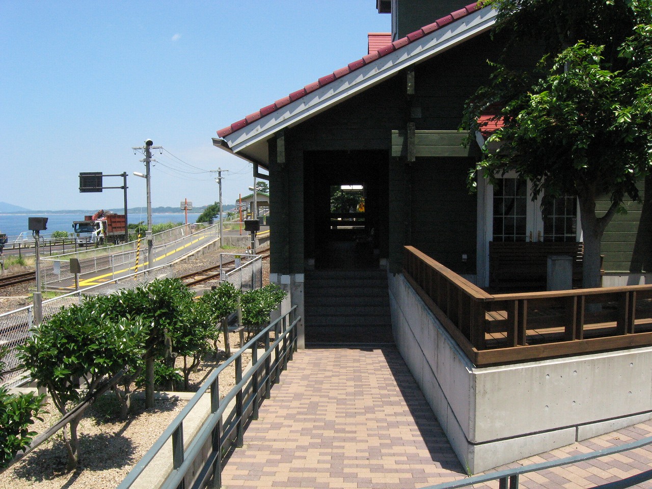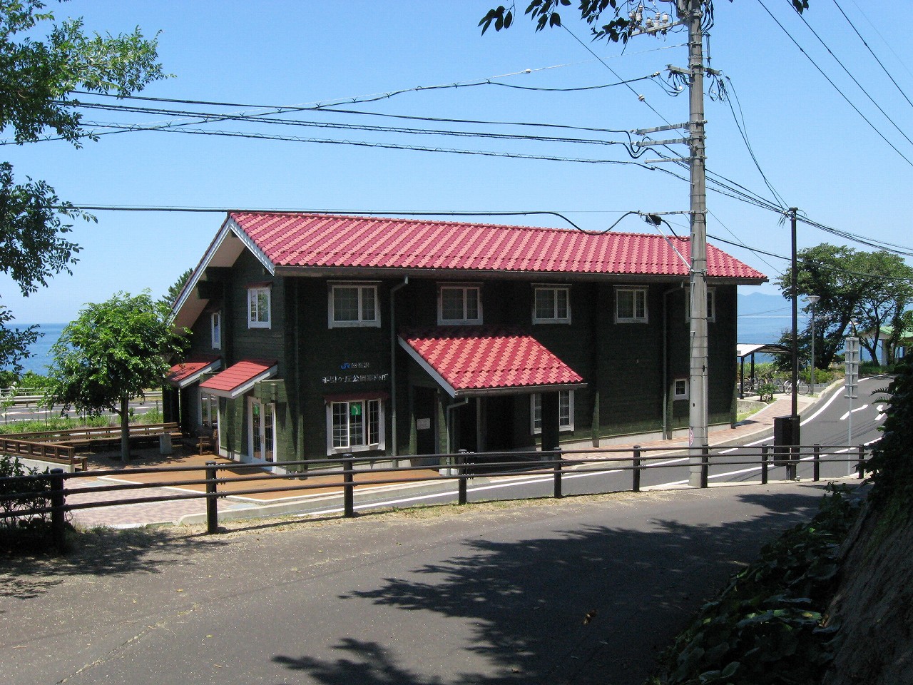 外に出るとたぶん旧道だったが、いろいろと整備されていて、暗さや古さはなかった。外観は駅舎としては変わっていて、総二階のペンション風。いつもの石州瓦ではなく、市松のピンクと朱なのに、山陰の風景と何気にマッチしていた。