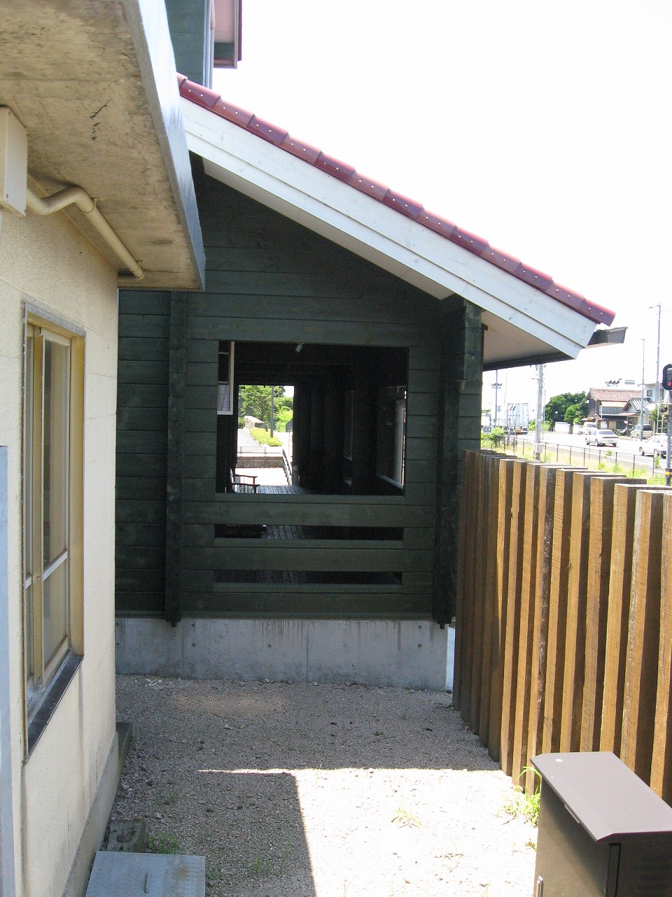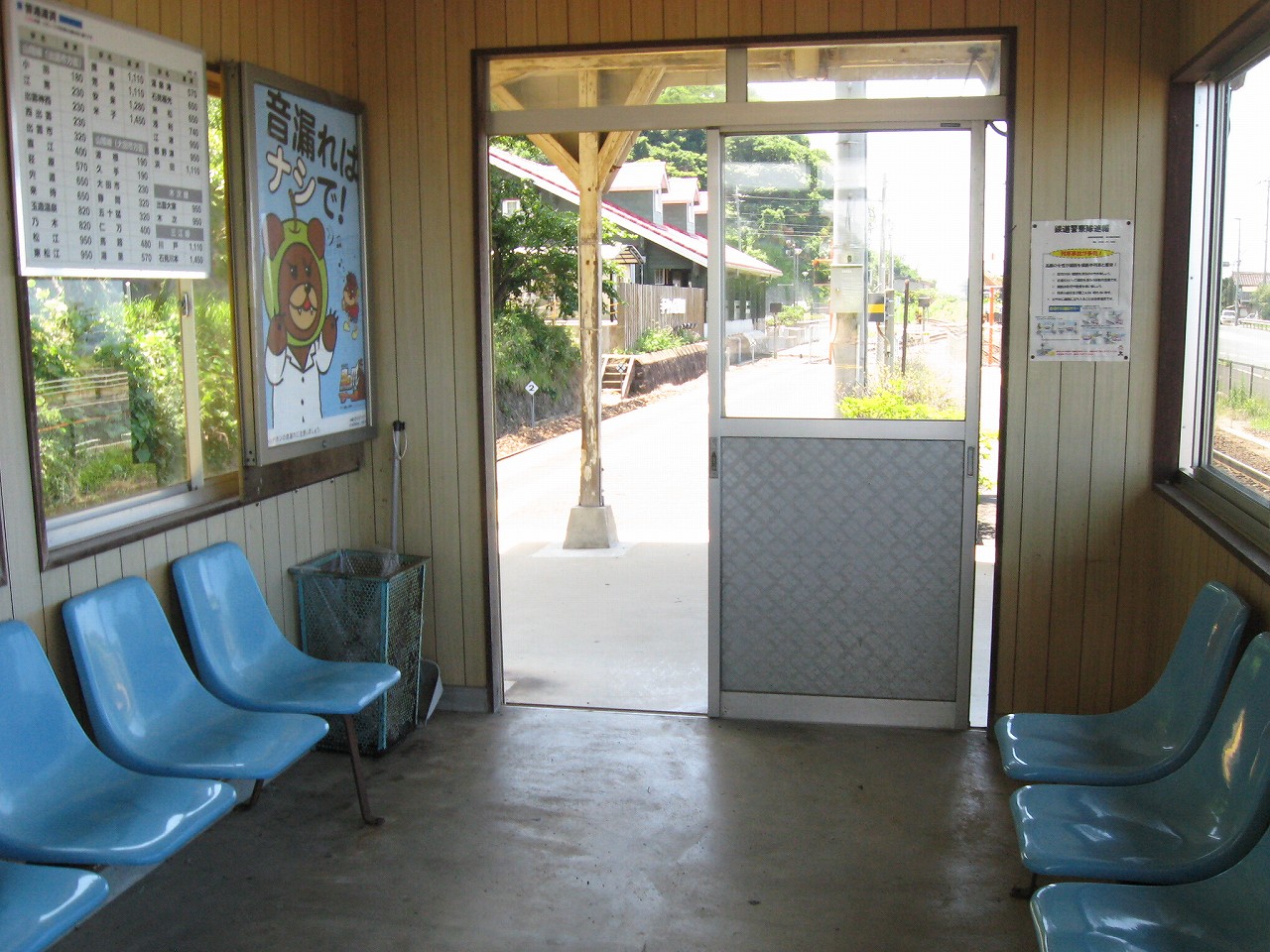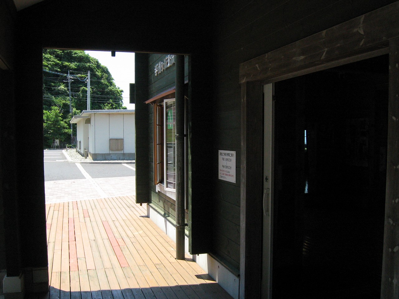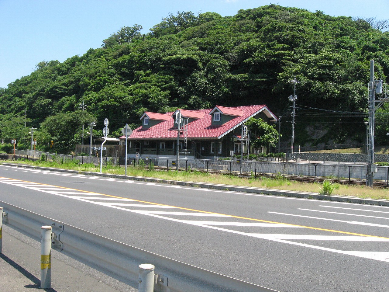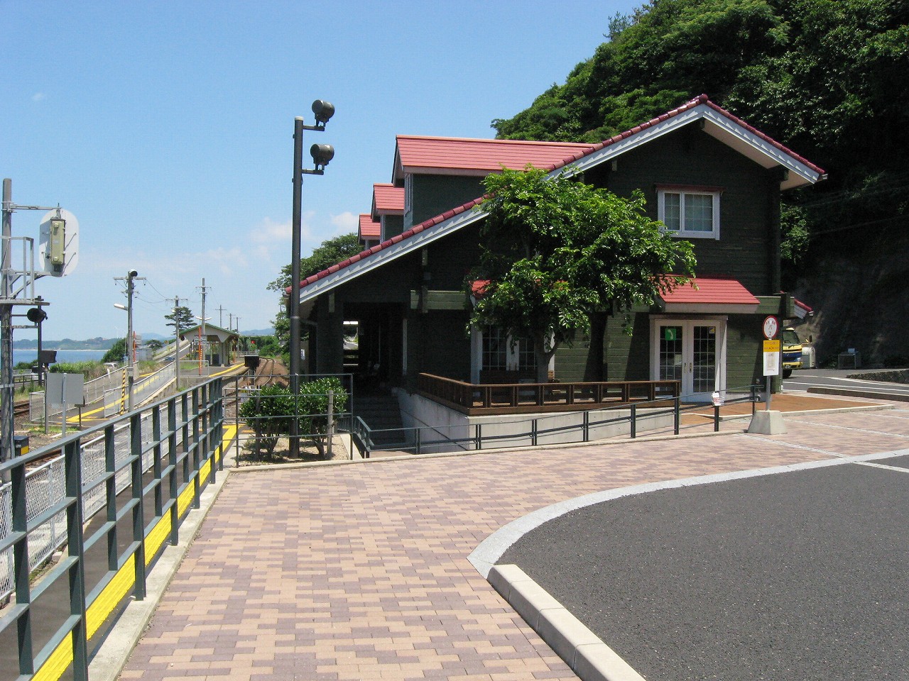 外に出るとたぶん旧道だったが、いろいろと整備されていて、暗さや古さはなかった。外観は駅舎としては変わっていて、総二階のペンション風。いつもの石州瓦ではなく、市松のピンクと朱なのに、山陰の風景と何気にマッチしていた。