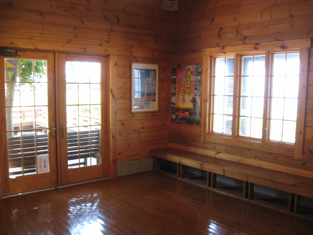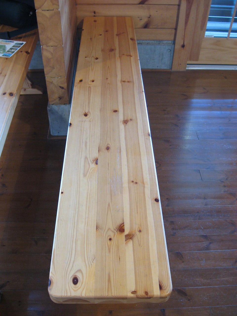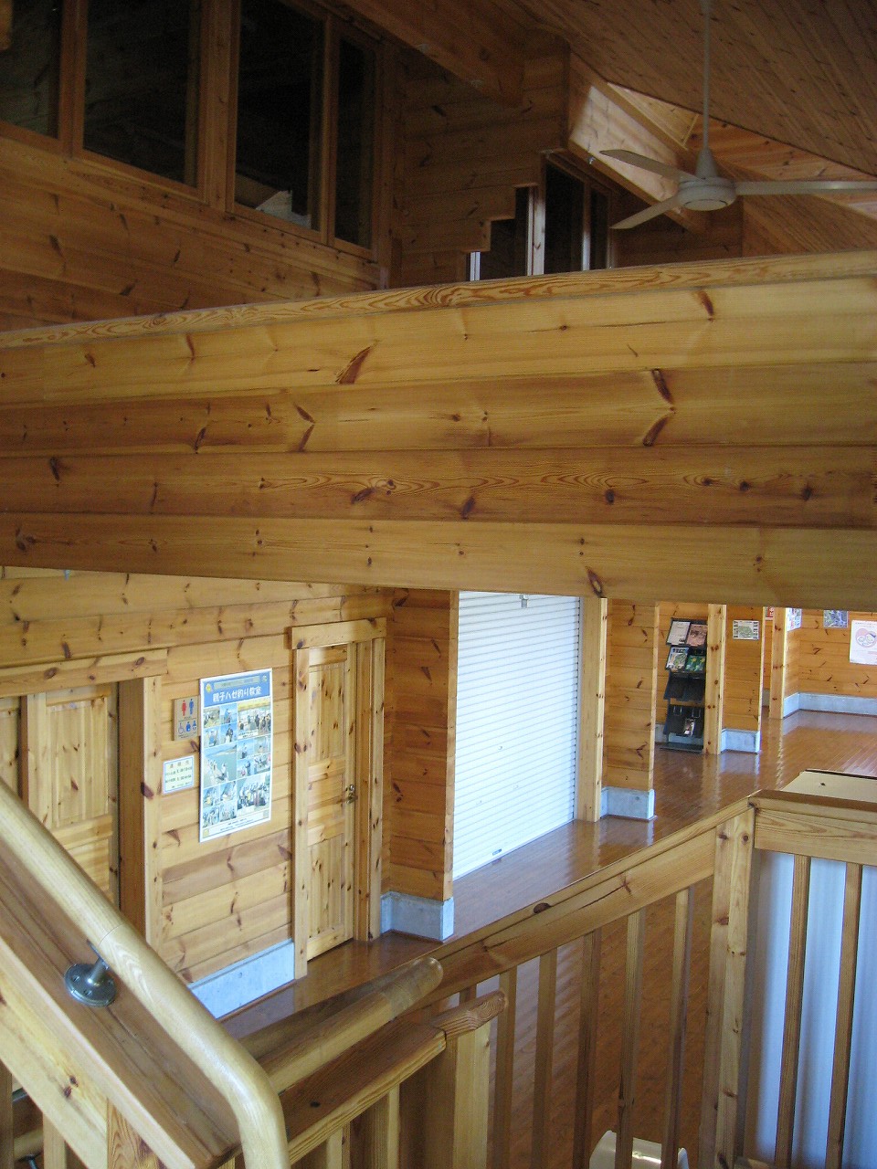 なんか少年自然の家を思い出す感じだ。壁からテーブルから椅子まで、地元の杉を使いに使いまくった宿泊施設だったな~