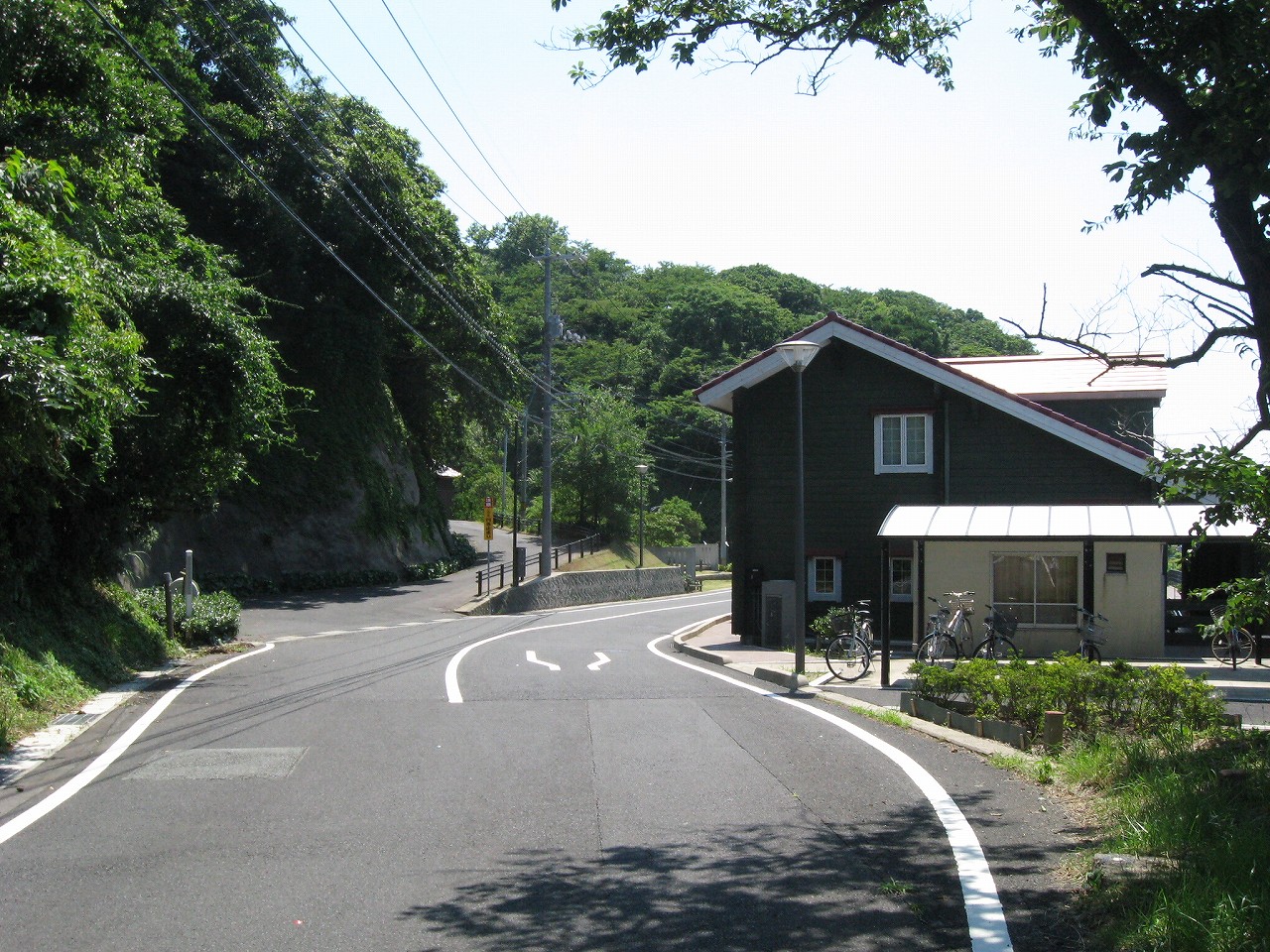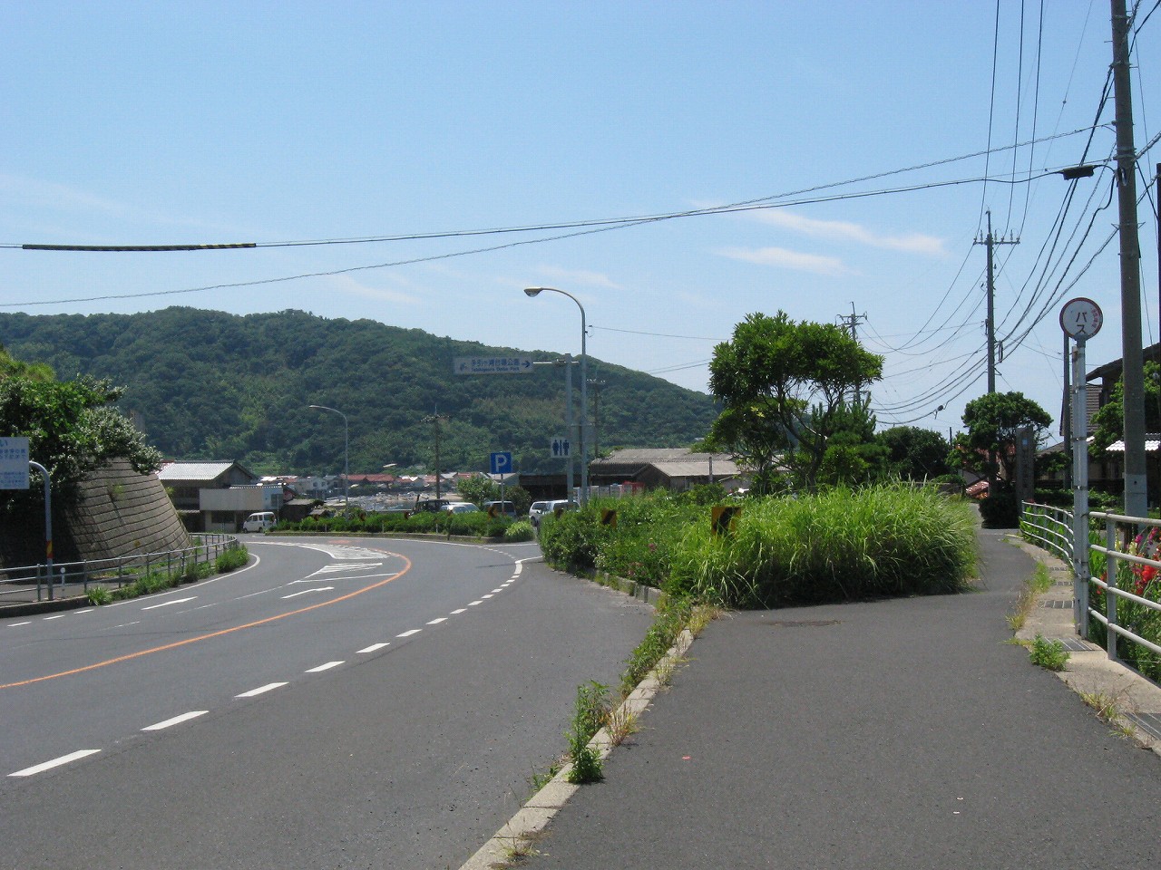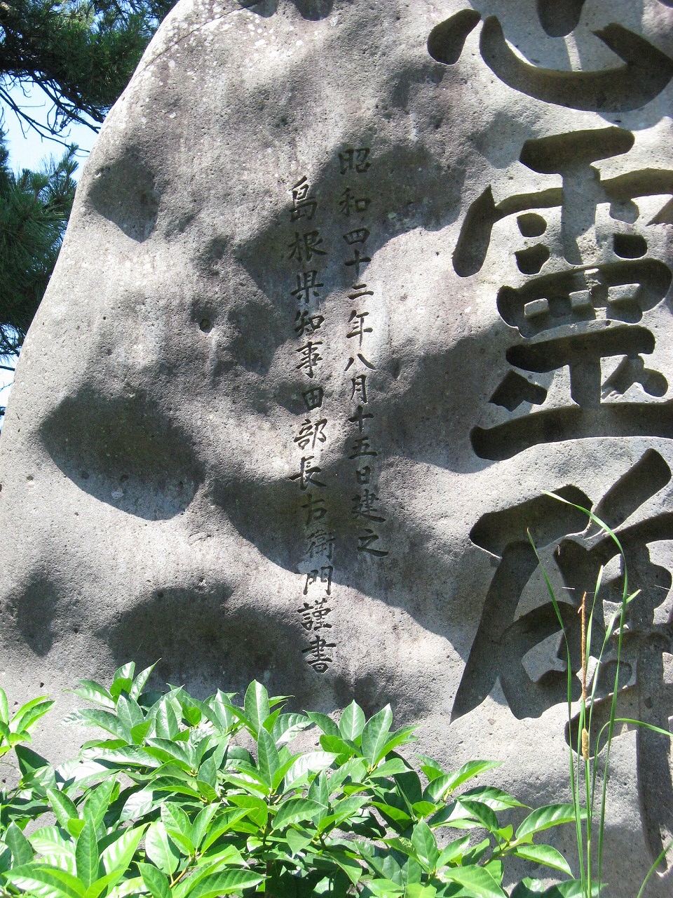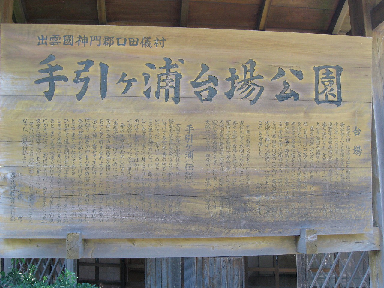 この辺は古代伝説や再現された江戸期の大砲などがあり、ちょっと歴史的な高台だ。これも出雲市の歴史に力を入れた観光化の一環なのかもしれない。にしてもうだるような暑さで、国道のアスファルトの照り返しがすごい。カーブのところは広く舗装してあって、パーキングに。かつては食事処もあったようだ。