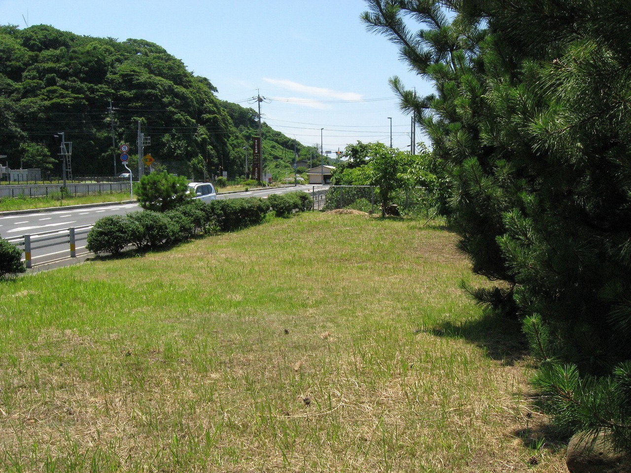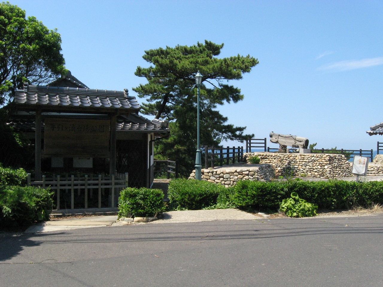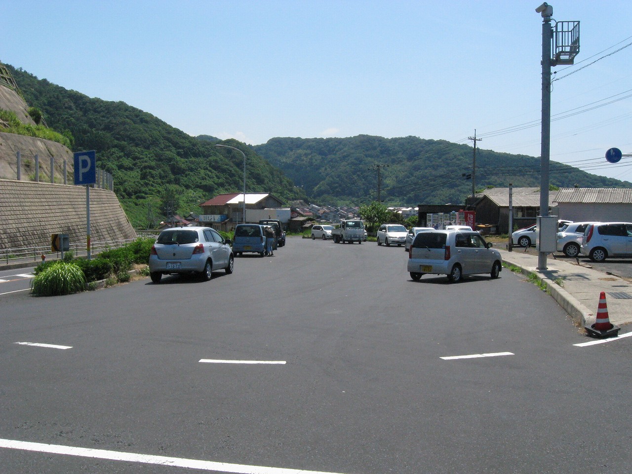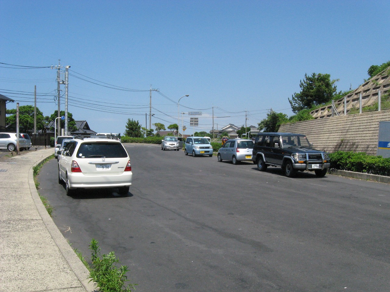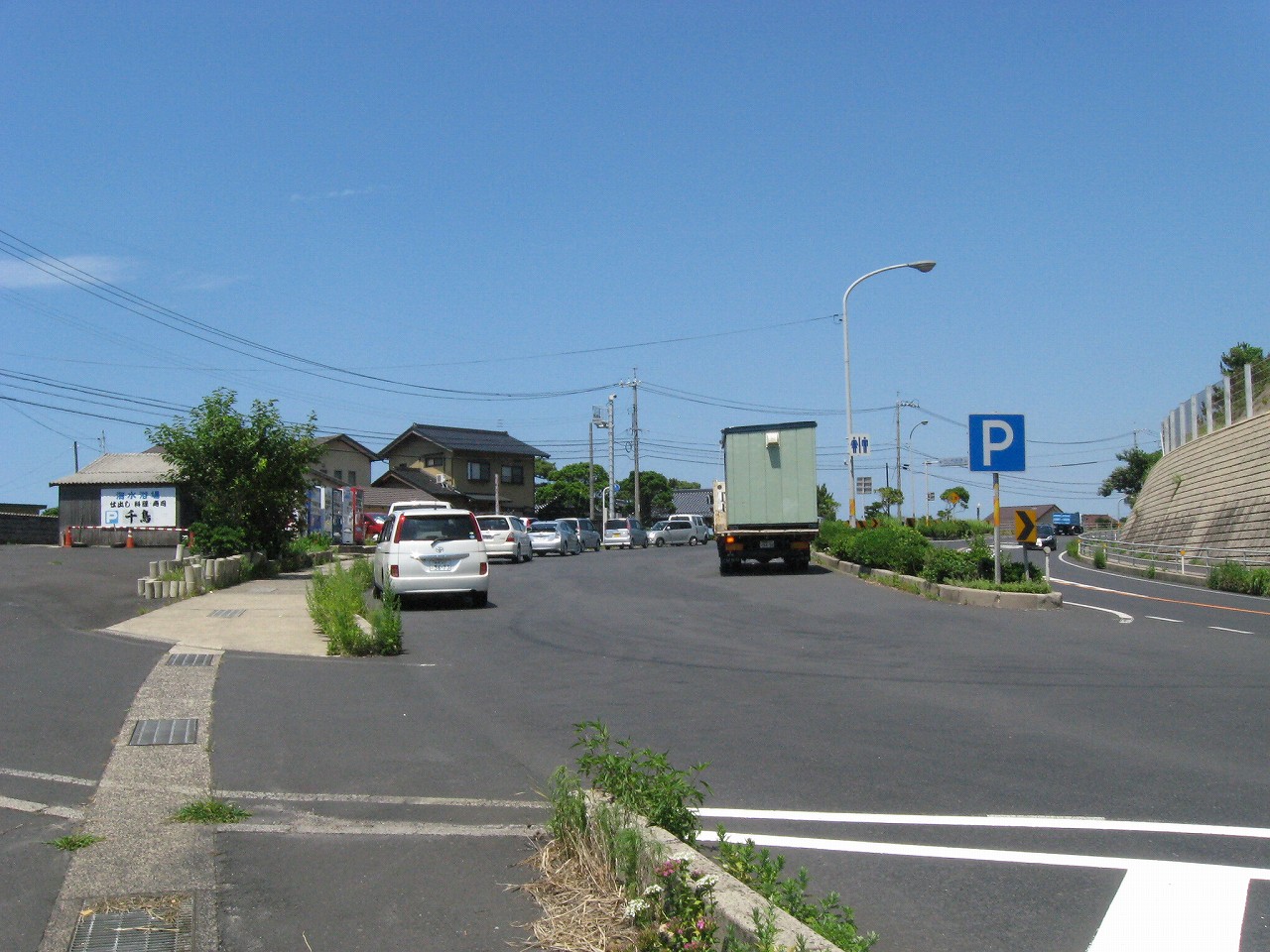 この辺は古代伝説や再現された江戸期の大砲などがあり、ちょっと歴史的な高台だ。これも出雲市の歴史に力を入れた観光化の一環なのかもしれない。にしてもうだるような暑さで、国道のアスファルトの照り返しがすごい。カーブのところは広く舗装してあって、パーキングに。かつては食事処もあったようだ。