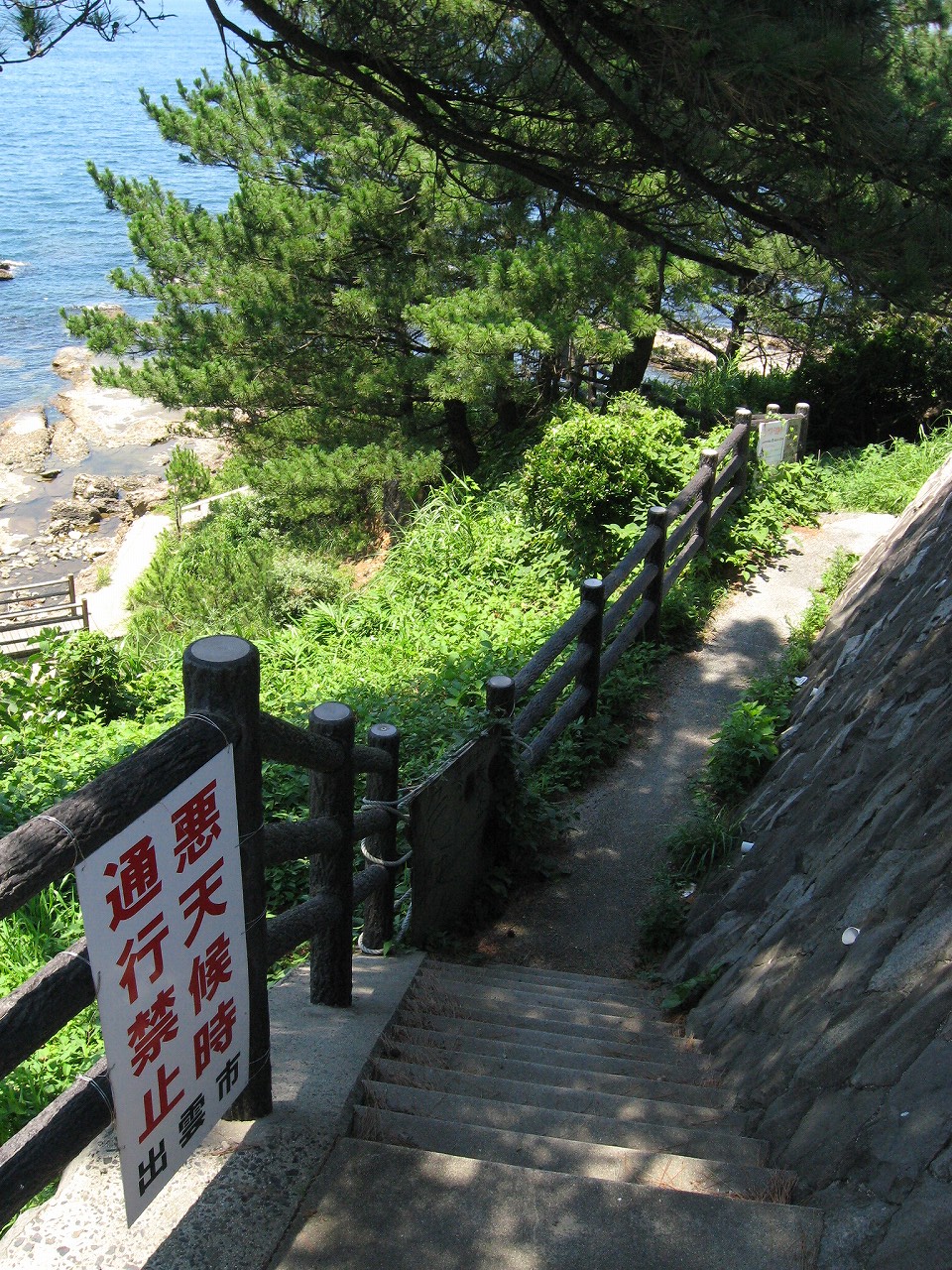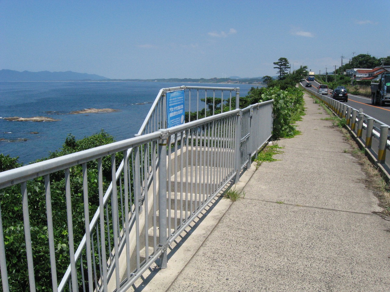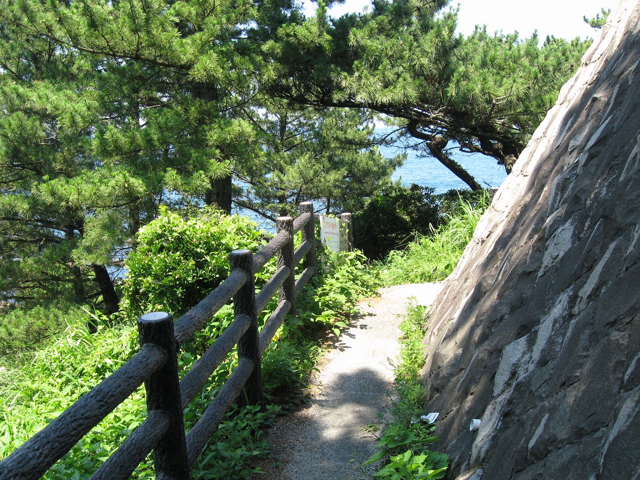 予想してなかったが、海岸に下りる階段があり、遊歩道があるようだ。やっぱここてだ下車するのはアタリだったんだな、と。ちょっとでもおもしろい道を歩きたい。